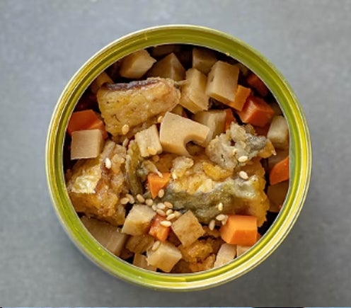 さわら、サバ、鮭、赤魚を骨ごとぶつ切りにして、魚特融の臭みをとる為カレー粉をまぶし一度、素揚げすることで最大限に魚のうまみを引き出し。レンコンやごぼうや人参の野菜を入れ、寿司酢を入れることにより、上品な『美味しさ』魚の骨まで食べられる『カルシウム』が含まれた『サカナカン』約2合の白いごはんと混ぜるだけであっという間にお寿司ご飯に! (ー六式会ー料理長プロデュース)