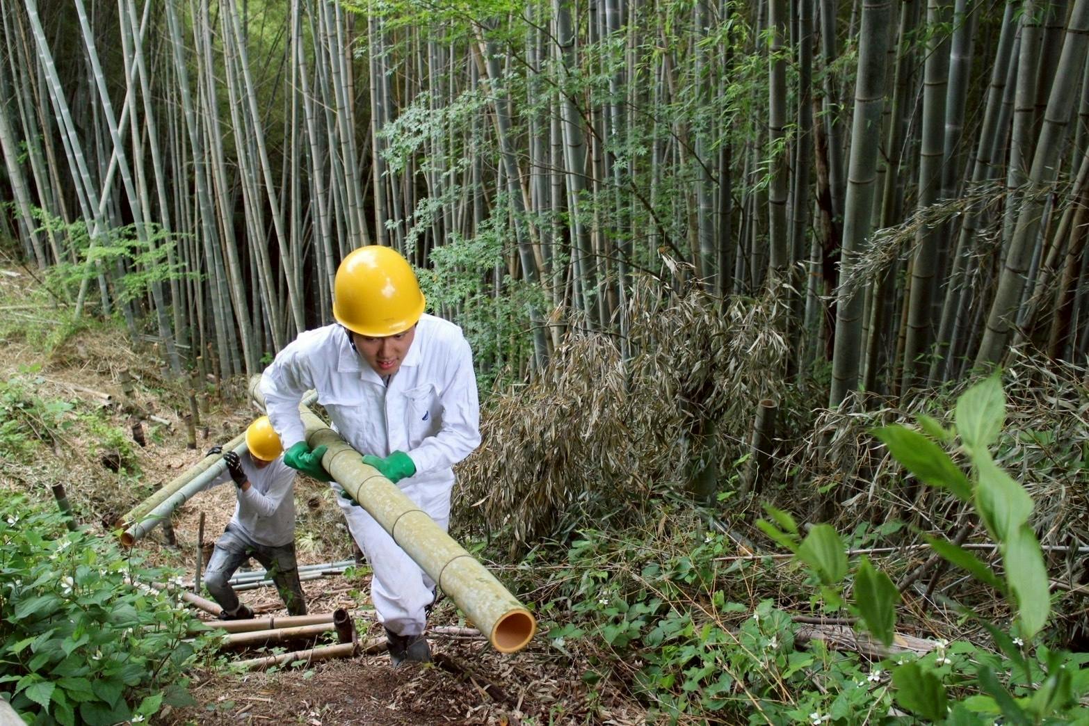 これまで私たちは、まず地域の竹林で竹を切り出し、一本一本丁寧に下処理を行うところから始めました。
