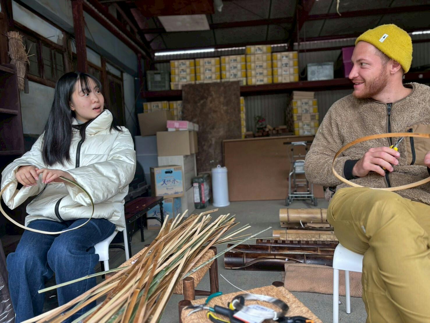 今日も竹の鞠の制作活動をしています!イタリアから来たユーリさんに作業を教えてもらっています。たどたどしいですが、頑張って英語で喋ってます!