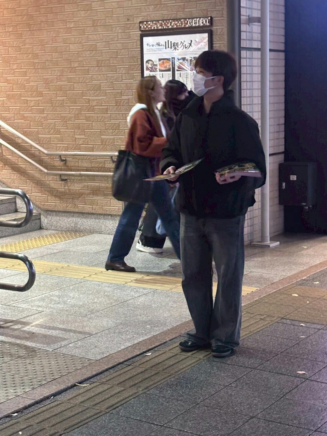 昨日、授業終わりの5時頃から甲府駅前でチラシ配りを行いました。