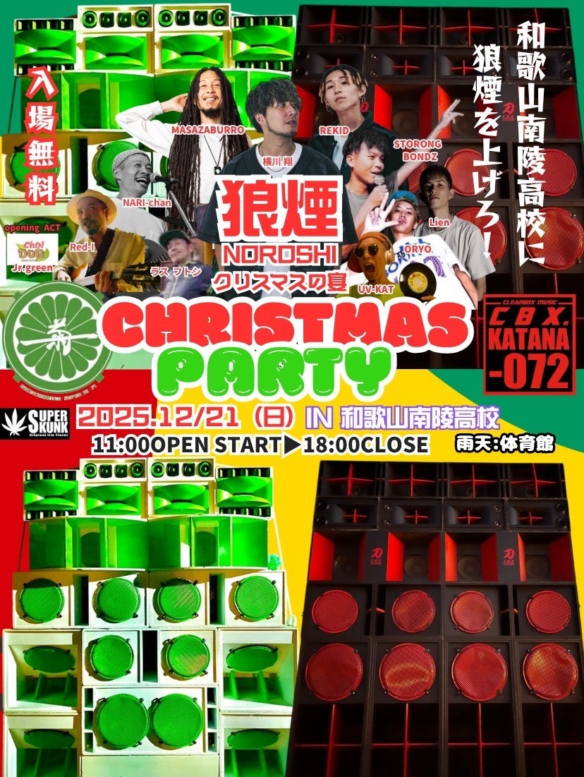 2025/11/25 13:55CAMPFIREのご支援してくれた皆様へ本当にありがとうございました!!目標達成まではかなり遠くなりましたが狼煙は全財産をこのイベントに掛けてます!来月12/21(日)は和歌山南稜高校で半端ないイベントやるので皆さん!ストレス発散しに遊びに来てください!!爆音の重低音で日頃の悩みを吹っ飛ばしましょう!レゲエが校歌の南稜高校の生徒達に本気のレゲエパーティーをプレゼントしますので皆さんも一緒に遊びましょう!当日はキッチンカーやマルシェが多数出店されます!入場無料なので家族連れて皆で遊びに来てね!狼煙 ~クリスマスの宴~【日程】12月21日(日)【 時間⠀】11:00 OPENSTART 18:00CLOSE【場所】和歌山南陵高校野外 ※雨天体育館【TICKET】 入場無料和歌山南陵高校に半端なくデカいスピーカーが2機登場します!ジャンルはそれぞれreggaeアーティストが勢揃い!南陵高校生の生徒達に本気レゲエイベントをクリスマスプレゼントするよ!レゲエのバイブスで狼煙をブチ上げましょう全国のラガ達、地域の皆様へ2025/12/21(日)全員和歌山南陵高校に集合キッチンカーやマルシェが多数出店します年末最後のお祭り思いっきり楽しみましょう叫べる!!はしゃげる!!ストレス発散しにきてね▪ゴミのポイ捨て▪喧嘩▪ルール、モラルは守って常識範囲内で遊んでください来た時より綺麗にを心掛けてくださいませよろしくお願いいたします【出演者】横川翔REKIDMasazaburroSTORONG BONDZRed-iNARI-CHANラス フトシSUPER SKUNKUV-KATLienORYOJr.greenONLY SOUND NARISESOUND SYSTEMCBX KATANA -072菊一文字SUPER Hi-Fi もっと見る