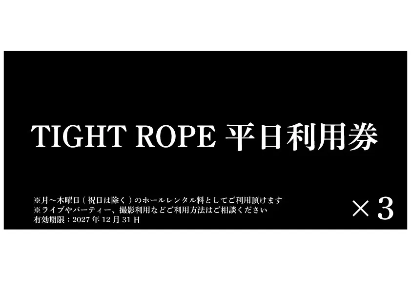 ※平日TIGHT ROPE利用チケットは月曜日〜木曜日(祝日を除く)のホールレンタル料としてご使用頂けます(有効期限:2027年12月31日)