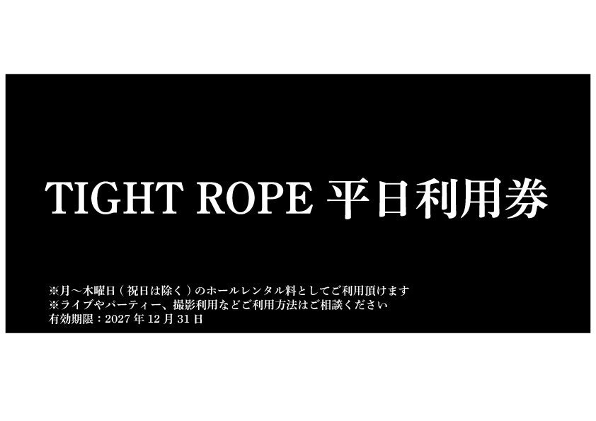 ※平日TIGHT ROPE利用チケットは月曜日〜木曜日(祝日を除く)のホールレンタル料としてご使用頂けます(有効期限:2027年12月31日)