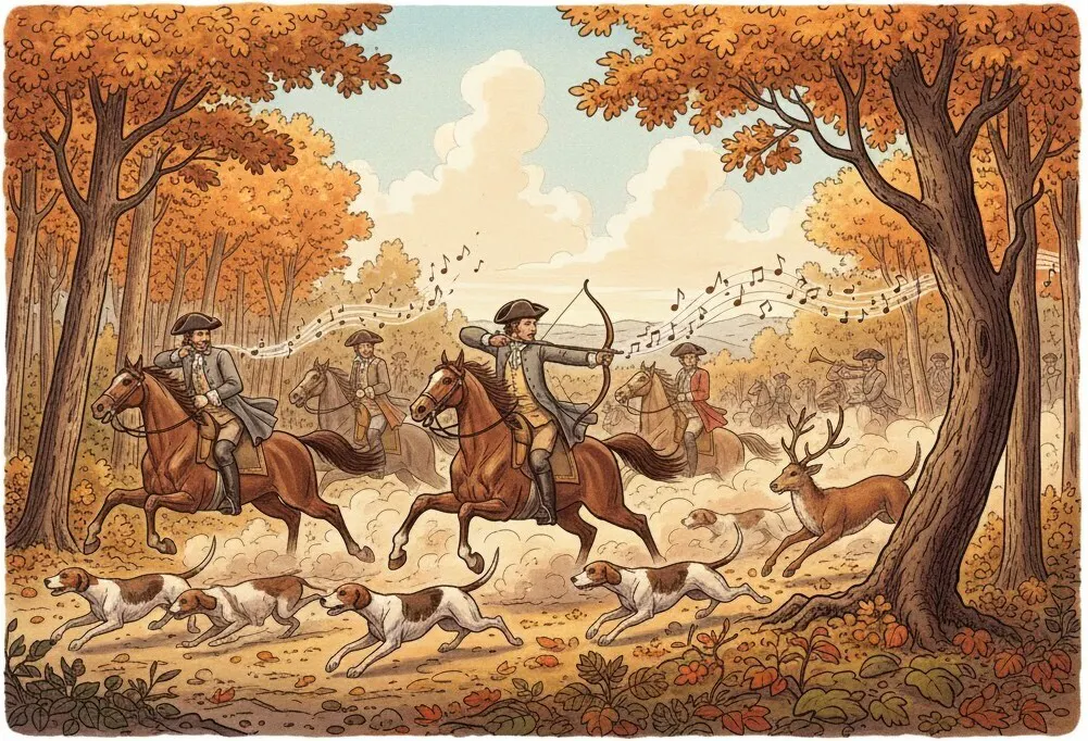 途中には、角笛を模したような合奏の音や、獲物を追い詰める緊迫した場面を思わせるようなフレーズも登場します。