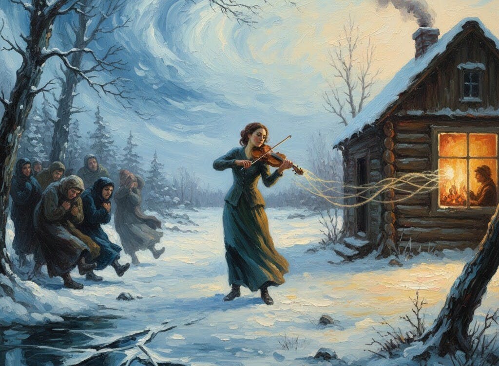 独奏ヴァイオリンには、細かく動く音型や突然の跳躍があり、緊張感のある描写が続きます。一方で、時折あらわれる温かく穏やかなフレーズには、暖炉の前にたどり着いたような安堵の気配も感じられます。