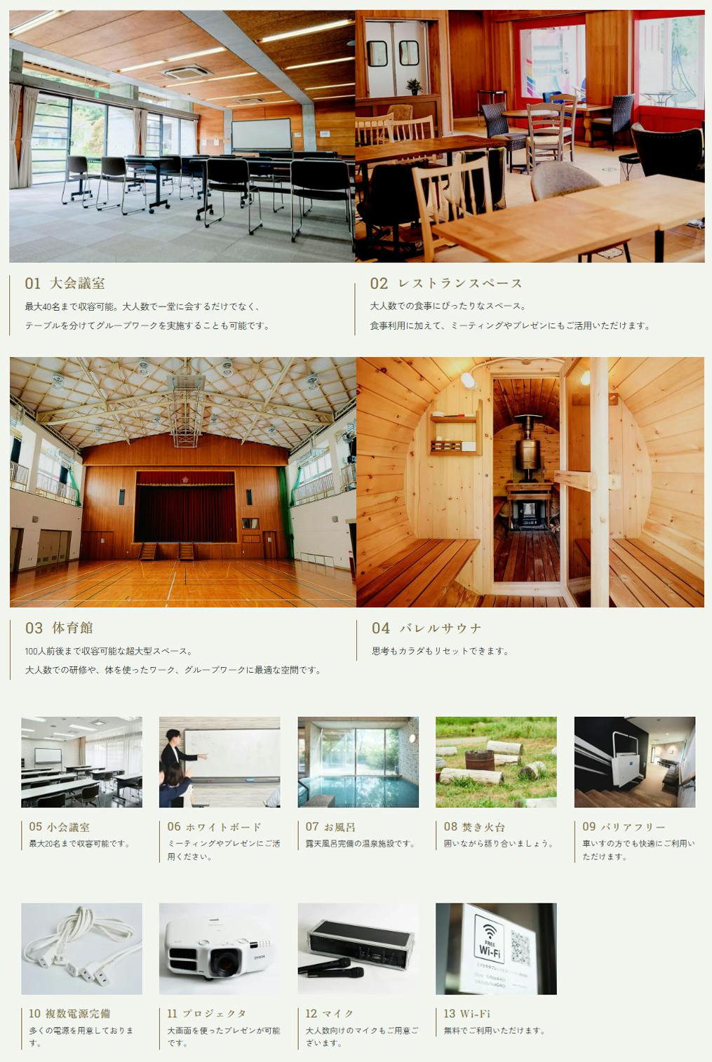 | ▼研修プランでは下記施設がご利用できます ・最大40名様までの大会議室 ・20名まで収容できる小会議室 ・バリアフリー対応 ・ミーティングに使えるレストランスペース ・100名まで収容できる体育館 ・人気のバレルサウナ ・露天風呂完備の温泉施設他 ・ホワイトボード ・焚き火台 ・複数電源完備 ・プロジェクター ・マイク ・Wi-Fi | |