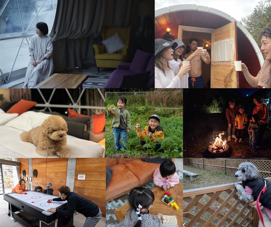 施設内には、グランピングテントやコテージ、天然温泉「いぶきの湯、地元食材を使ったレストラン「ル・クロ」、 農業・収穫・焚火・ワークショップなどの体験エリアが揃い、宿泊・癒し・体験・研修が一度に楽しめます。