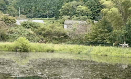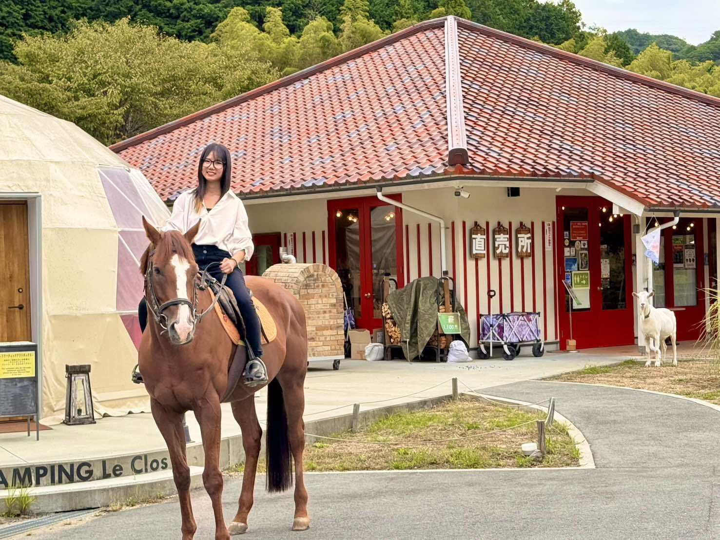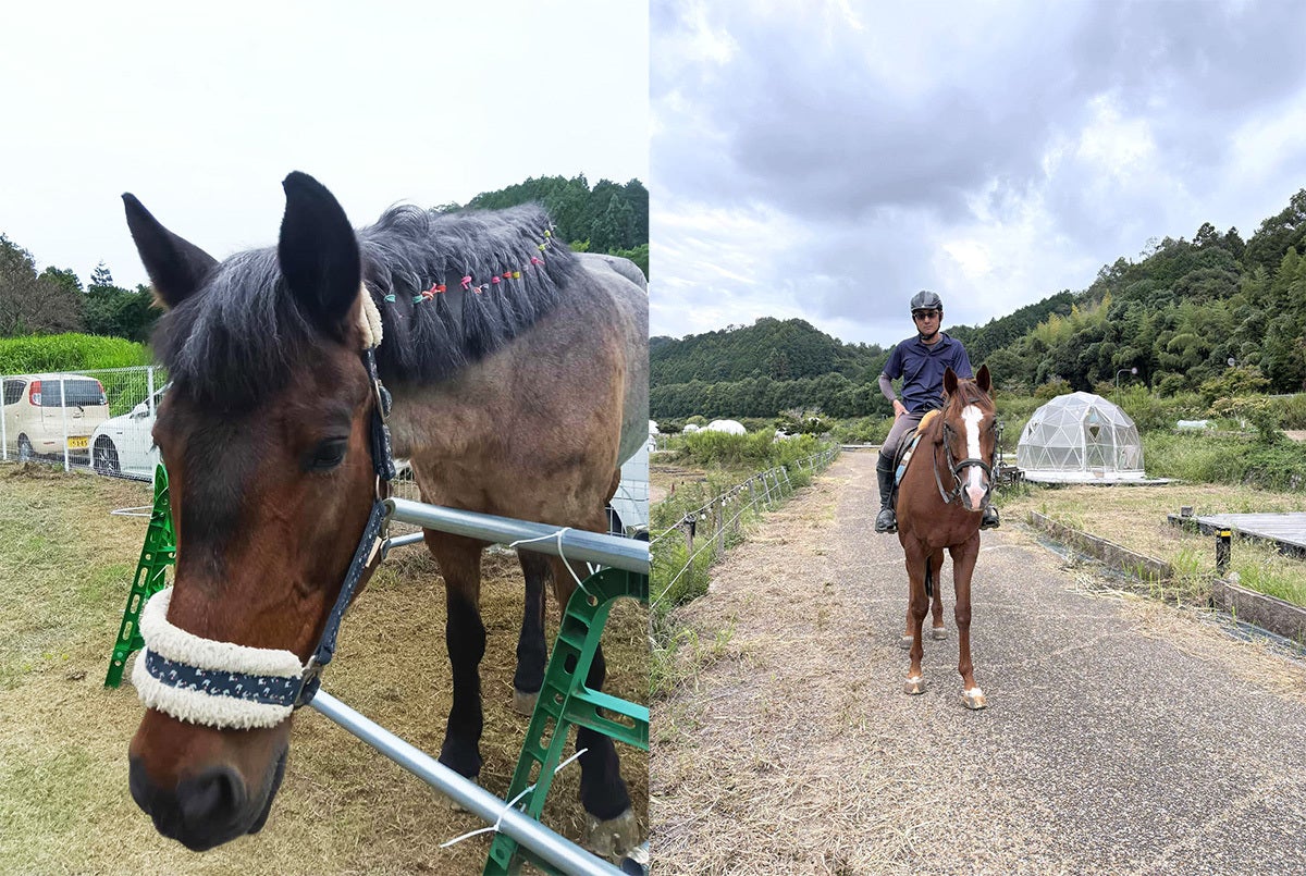 馬がグランピングエリアの橋を少し怖がるため、現在は奥の「竹や椎茸の森」を活かしたロングコースで練習中です。その姿を見ているだけでも、どこか心があたたまりますよ。