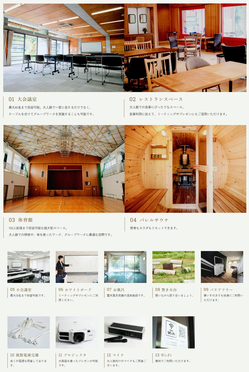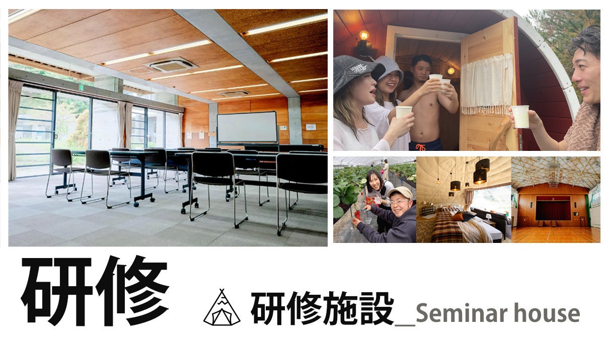 • 「かいづか いぶきヴィレッジ」の温泉エリアでは研修施設もございます。収穫体験や、バレルサウナや、100人前後まで収容可能な体育館など大人数での研修や、体を使ったワーク、グループワークに最適な空間をご用意しております。