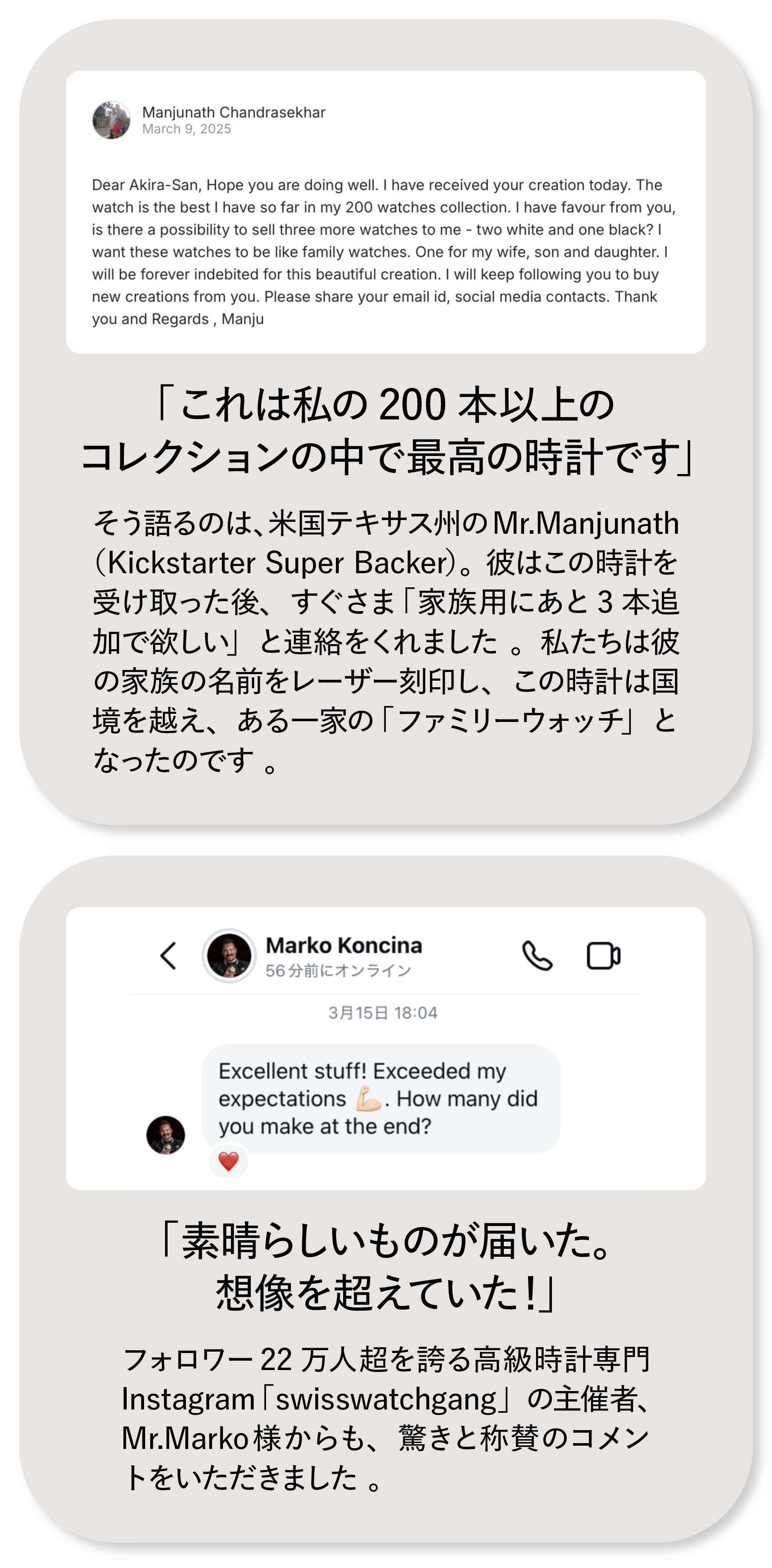 このプロジェクトは、単なる時計の製造にとどまらず、歴史と現代をつなぐ架け橋としての役割を果たすものです。多くの方々にご賛同いただき、共に新しい物語を紡いでいくことができれば幸いです。皆様の温かいご支援とご協力を心よりお待ちしております。