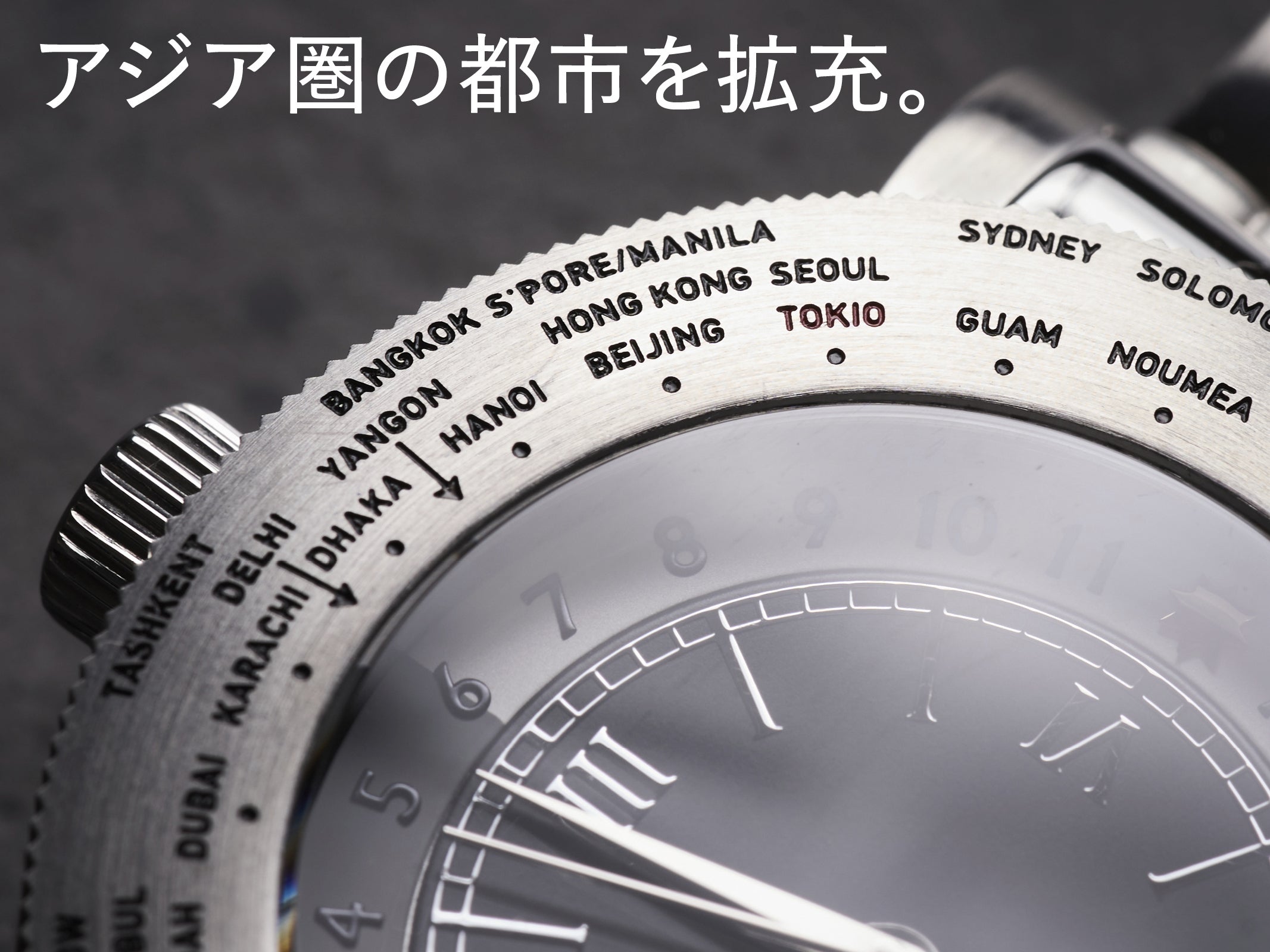 前作の31都市名を刻印したモデルは、1940年代のオリジナルモデルに記されていた都市名をほぼ忠実にベゼルに再現。当時はGreenwich Mean Time(通称GMT)と呼ばれる、英国にあるグリニッジ天文台を基準とするグリニッジ標準時しか存在しませんでした。