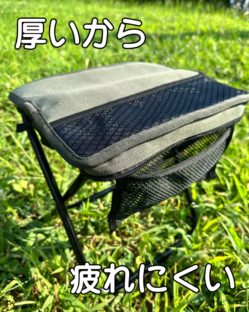 コンパクトながら厚手のシートを採用し、しっかりと体を支えてくれる安心設計。短時間でも長時間でも、“快適に座れる”が実感できる一脚です。