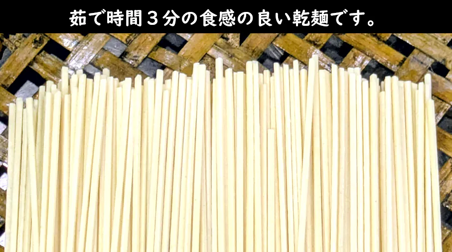 麺につきましては前職の三輪素麵の企業に勤めた経験を生かして美味しさが長続きする乾麺を採用させていただきました。数ある麺から茹で時間3分の小麦の香りのよいノンフライストレート麺を採用させていただきました。時短料理が出来て食感の良い麺でございます。180g(2人前)結束なしのバラの状態で袋に入れております。