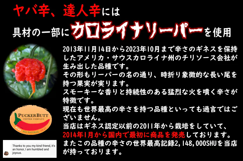 唐辛子を育てて28年、これまで4000品種のとうがらしを栽培してきて、特に世界最激辛クラスの唐辛子では世に知られるまで成長いたしました。近年の激辛ブームで知られる“カロライナリーパー”など数品種のとうがらしは当店が日本で初めて関連商品を発売させていただいております。