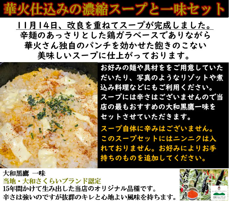 華火さんの衝撃的なパンチ力のあるスープの美味しさが今回のスープのベースとなっております。