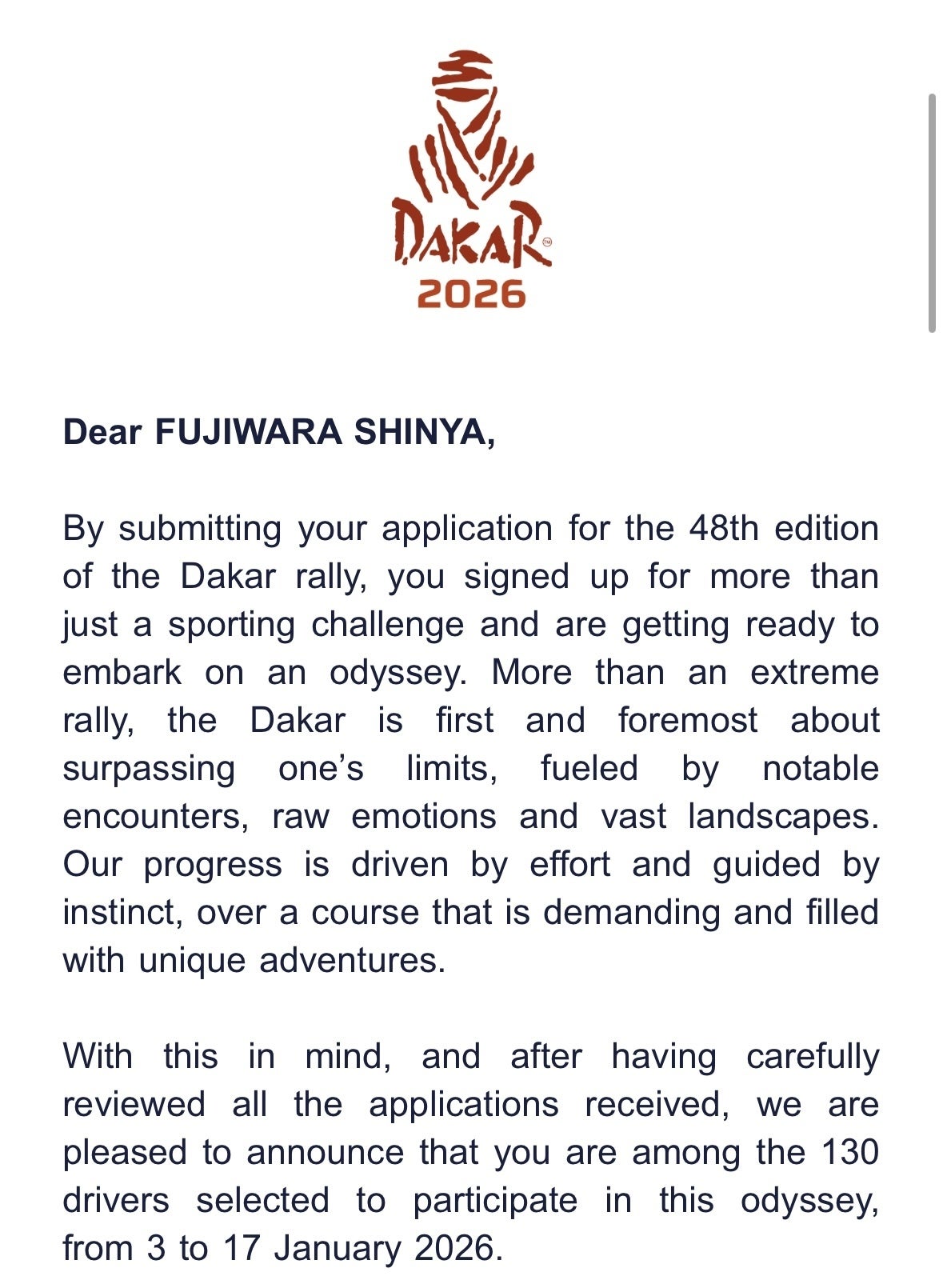 そしてついに――2026年ダカール・ラリー、バイク部門に挑戦する130人の一人に選ばれました。世界中からの応募者の中で、戦歴や実績が精査され、その結果として得られた切符です。
