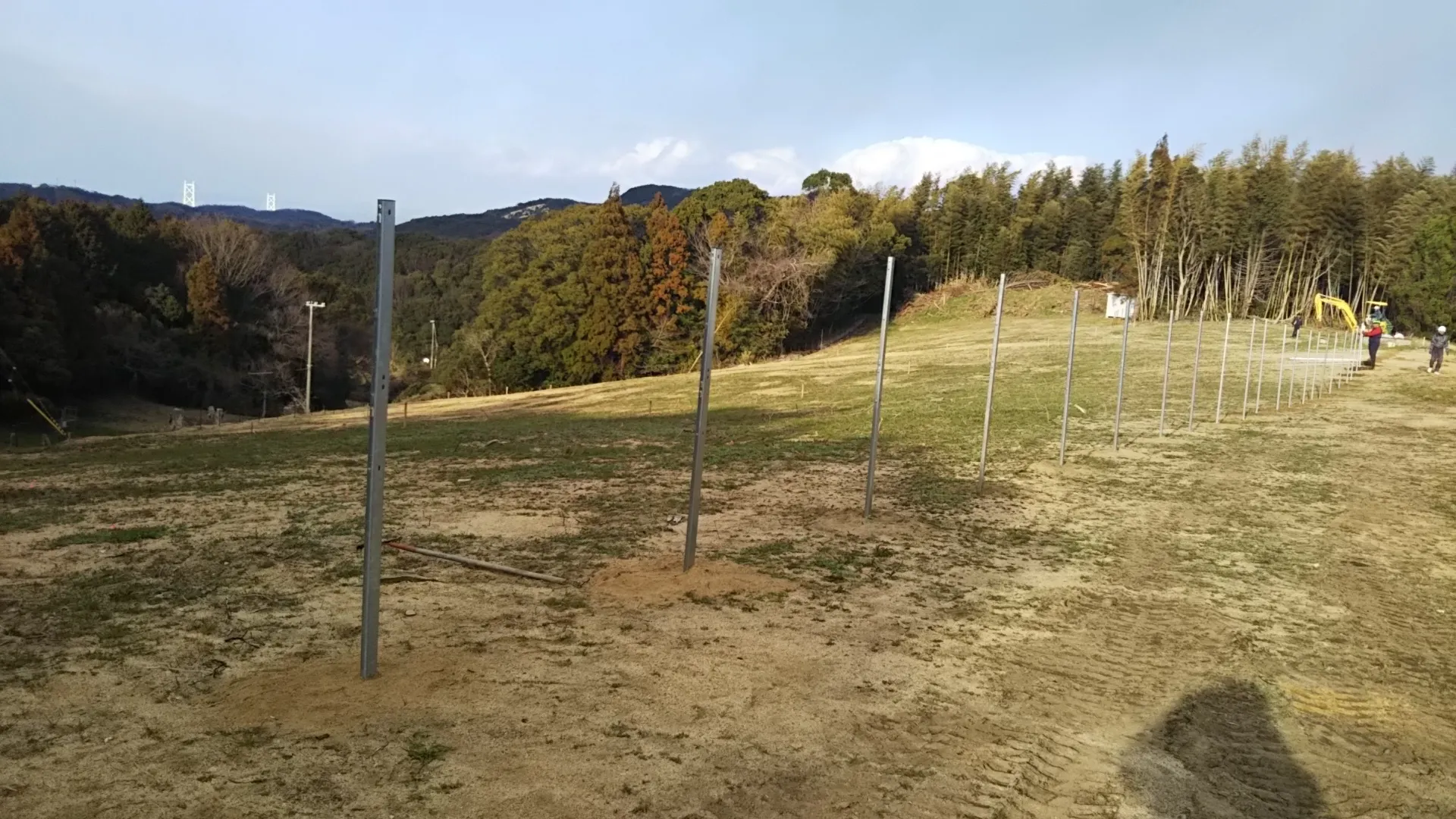 イノシシの獣害対策として、友人や父と一緒に、アニマルフェンスの支柱を設置し、0.9へクタールの外周(1へクタールは100m×100m)にフェンスを張りました。