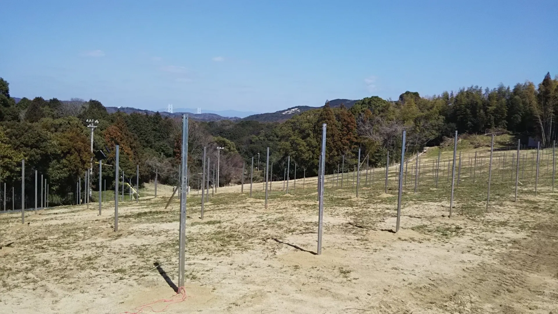 昭和40年代に国が開発・整備したみかん畑だった場所、冬場北風が強く吹くため、淡路島のみかんはおいしいが皮が固いと言われ、徐々に市場から消え、生産者は栽培をやめてみかん畑は自然と消滅し耕作放棄地となったと伺っています。年間降雨量は、淡路島の他地域と比べて少なく、海風が吹く日当たりの良い北向き斜面地、土質は砂質土壌で水はけがよい、約0.9ヘクタールの一枚の畑。まさに、ぶどうの栽培にぴったりです。
