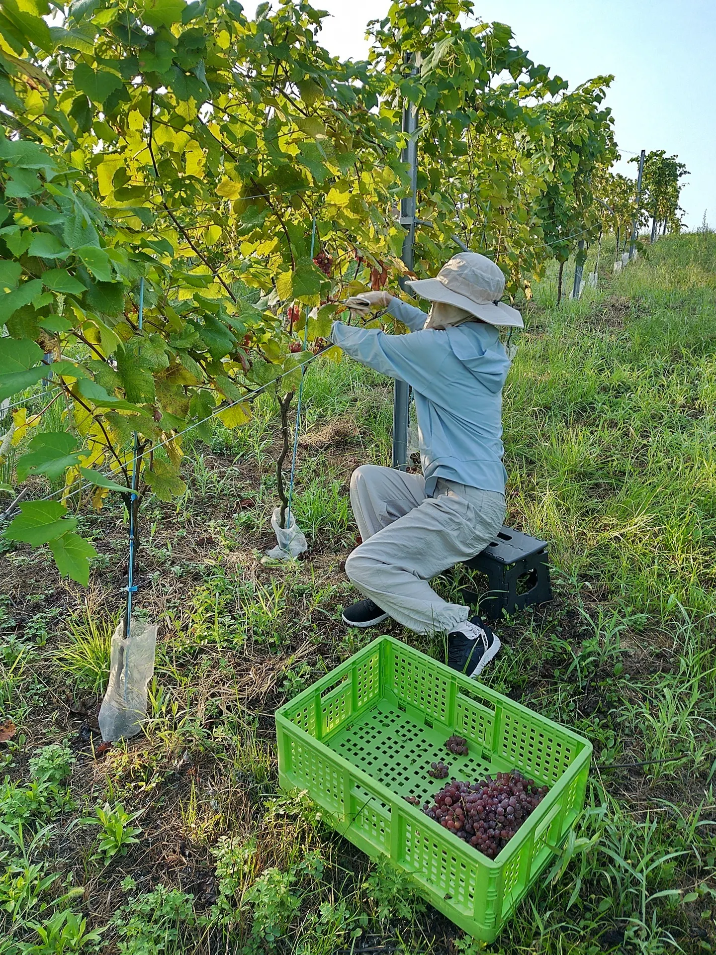 今年のぶどうの収穫量は約2トンで、苗木も順調に成長し来年はさらに収穫量が増える予定です。畑近くにワイナリーを作ることができれば、輸送時間や輸送コストを削減でき、選果作業、収穫直後の冷蔵保管等など、ぶどうにとってベストな状態で、おいしいワインに仕込むことができるのです。そのため、2024年から自社ワイナリー設立に向けて、準備を始めました。(国の計画認定申請(総合化事業計画)、補助金の申請準備、融資の相談、農地転用の相談、淡路市の認定農業者の申請相談など)