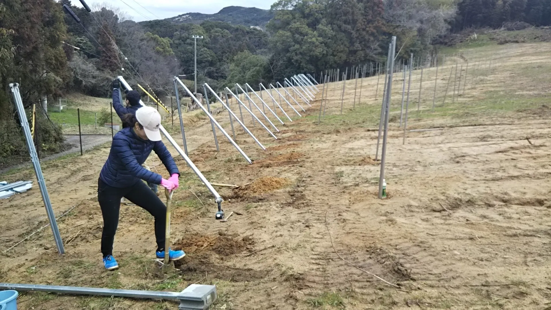 その後、支柱にワイヤーを張り、雨除けカバー用のアーチを支柱に設置するなどの作業を行い、ぶどう栽培が本格的に始動しました。