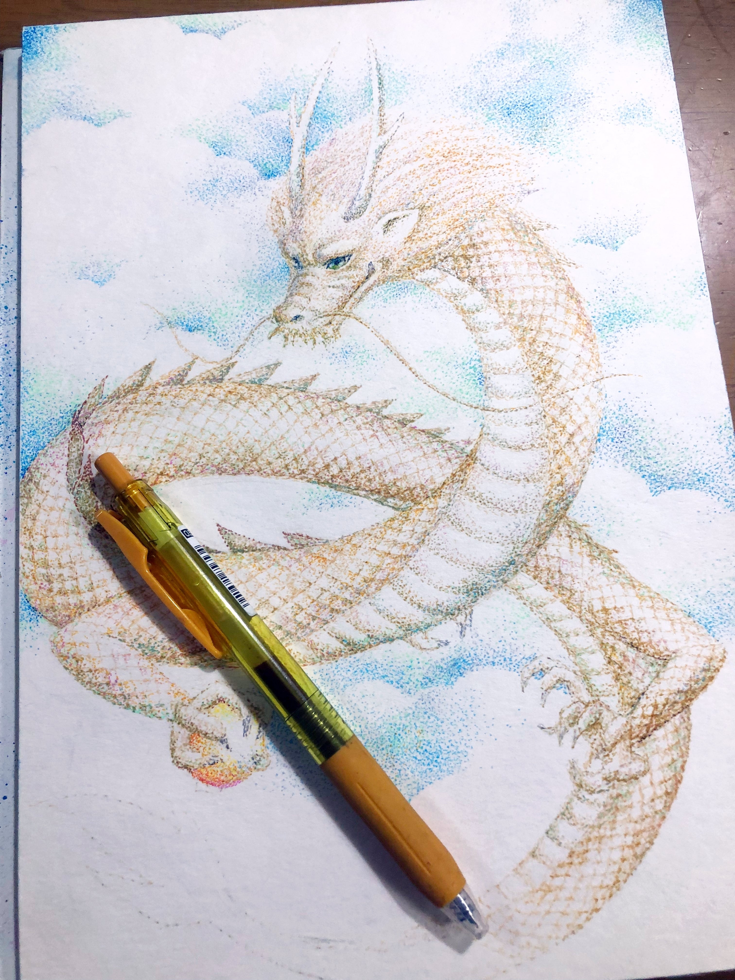 どこにでも売っているゲルインクペンを使い、点描で龍を中心に描いています。