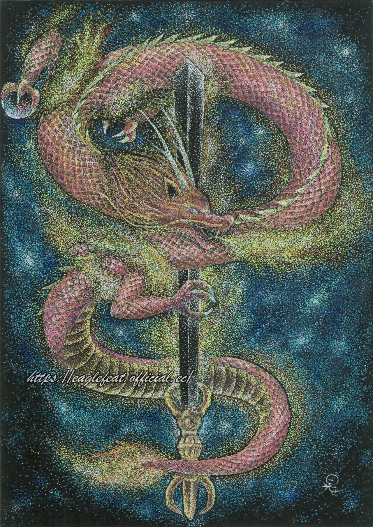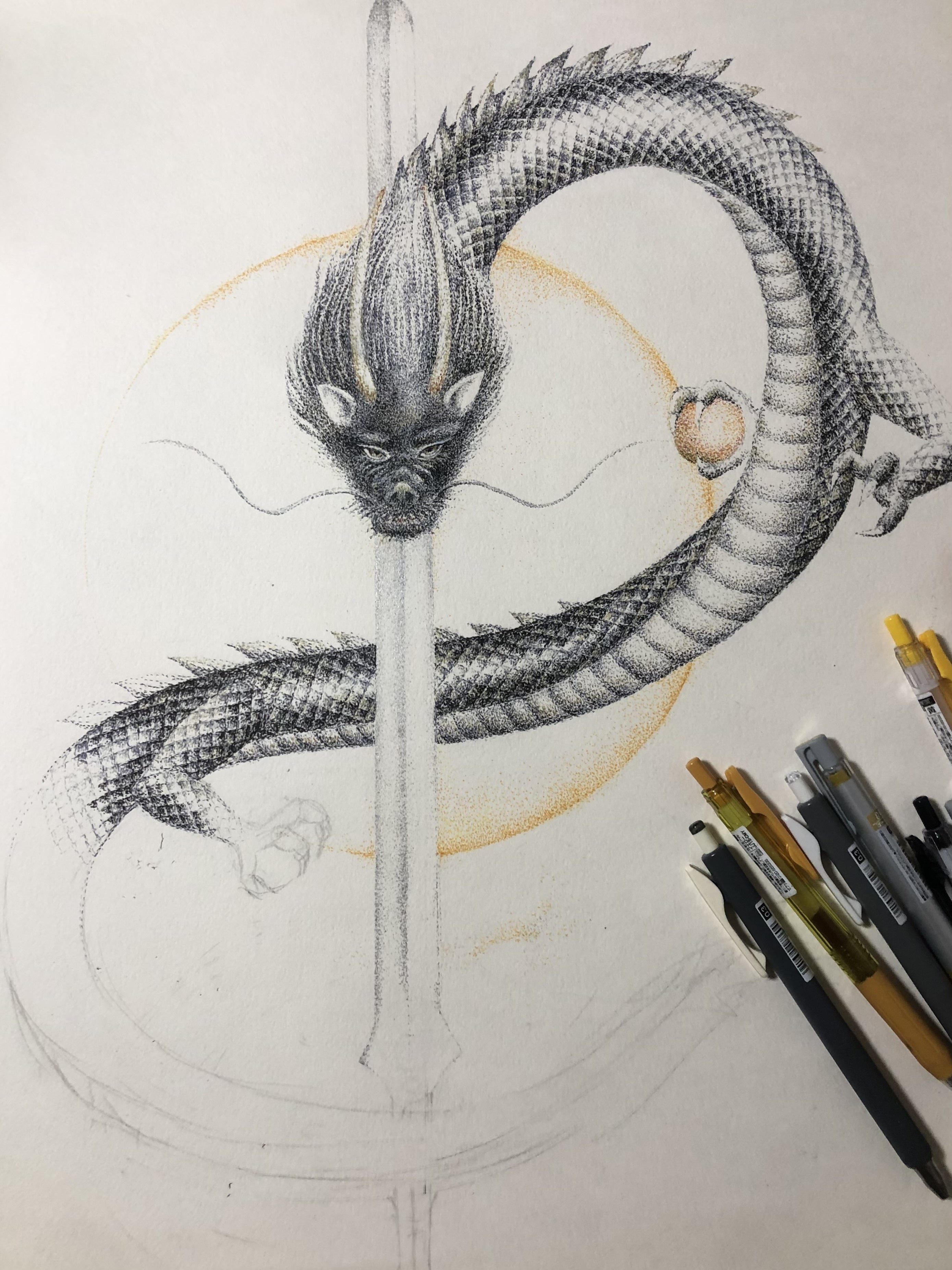 見えないその小さな粒をペン先に込めて「点」という形で重ね、龍の姿を作り上げていっている、そんなイメージが近いかもしれません。