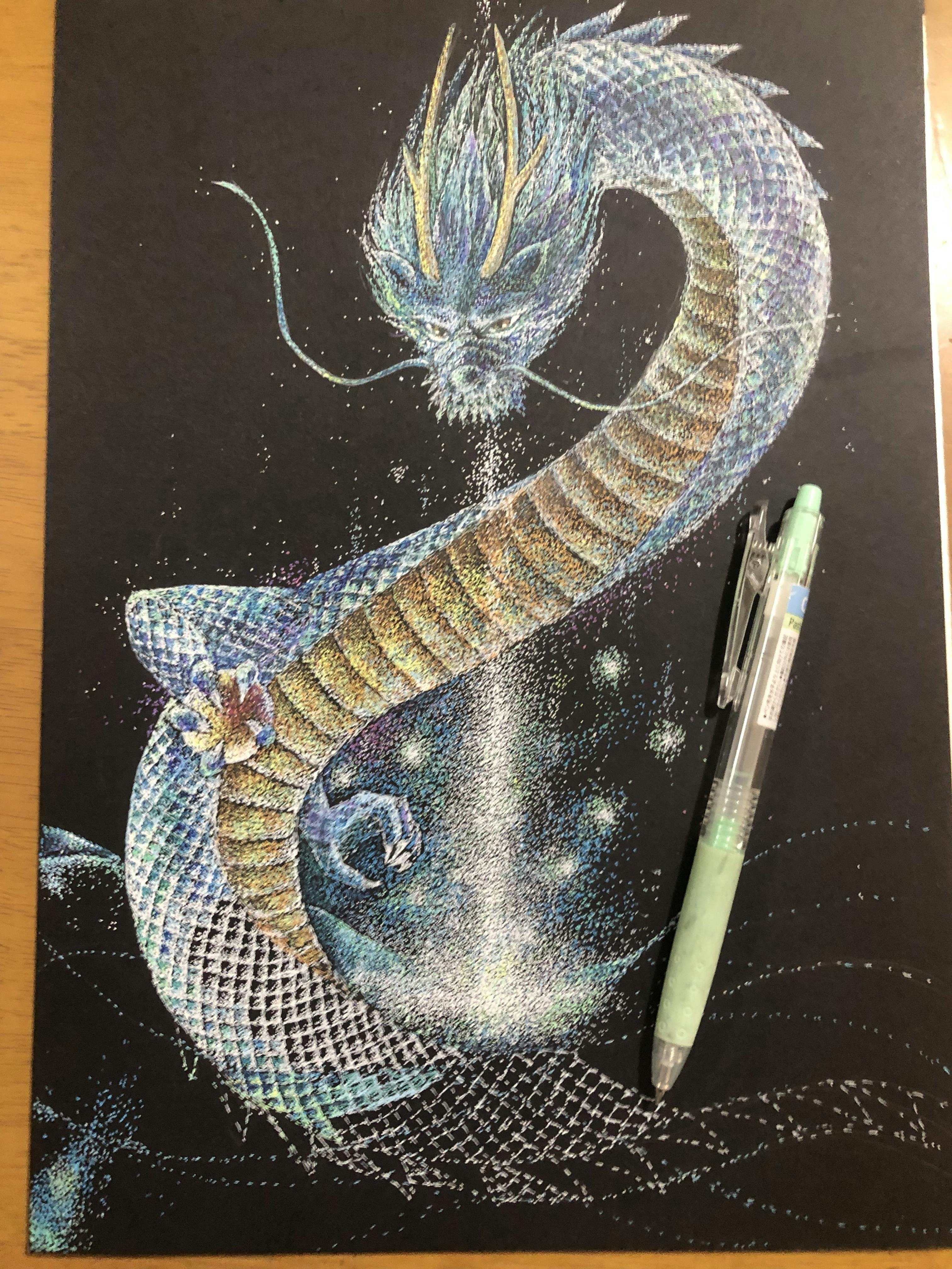 そして2022年2月にInstagramのリール動画で点描している動画がプチバズりしたことをきっかけにゲルインクペンを使用して点描で龍を描くことを中心に活動するようになりました。。