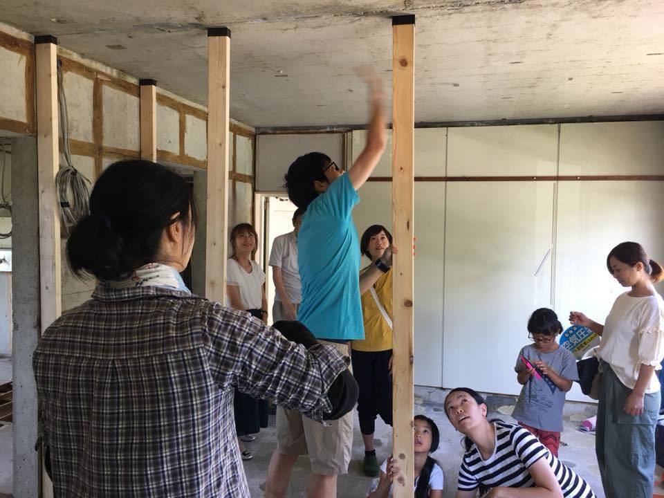惣菜カフェになる団地の空室解体後のお部屋に、ラブリコを柱とした壁やチラシラックを作るワークショップを行いました。作業の説明は19棟集会所で、その後現場の棟へ移動しました。