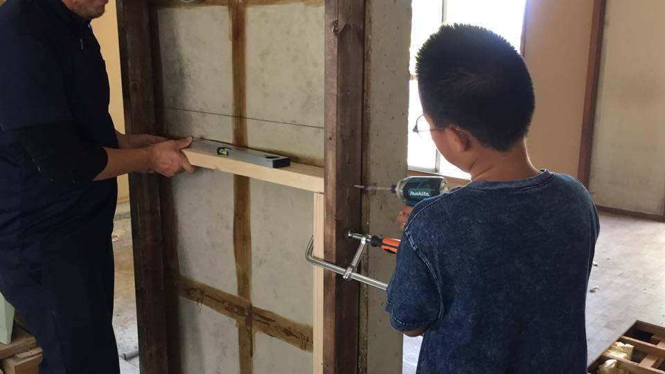 そして、最後に柱が真っ直ぐ立っているか測量し、棚の寸法を測り丸ノコで木材を切断して、ドライバーで取り付け今日のワークショップが無事終了いたしました!
