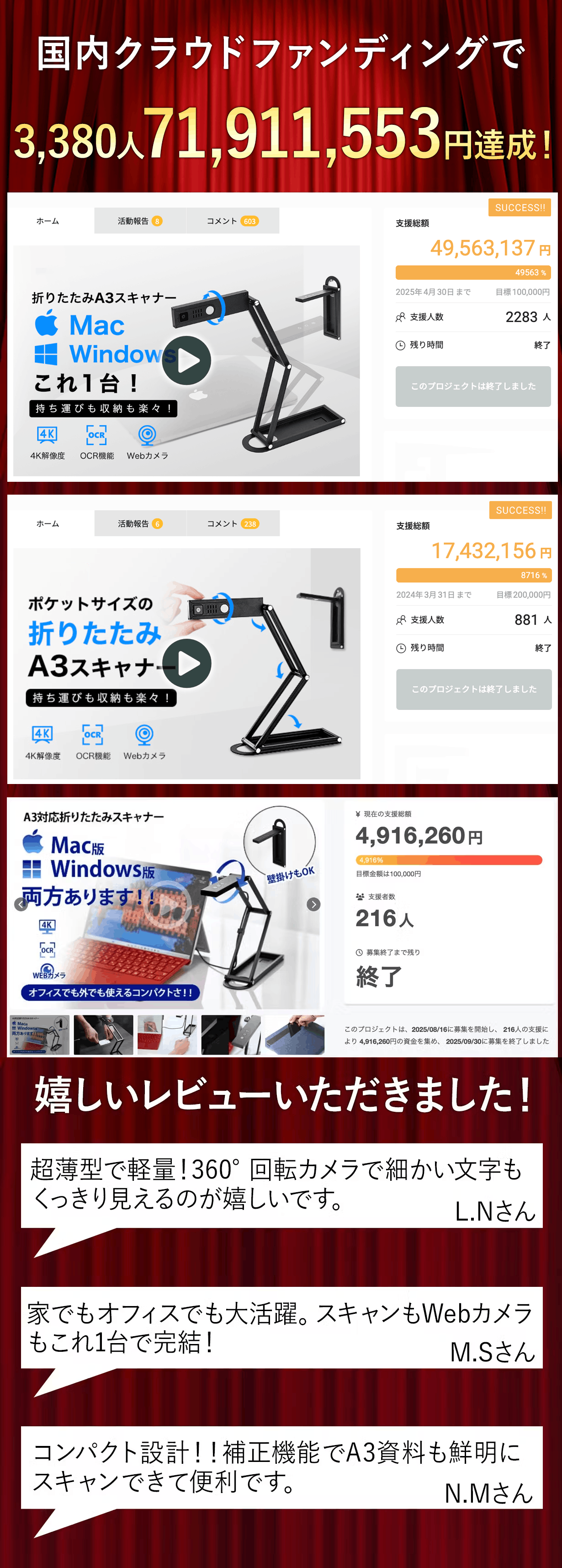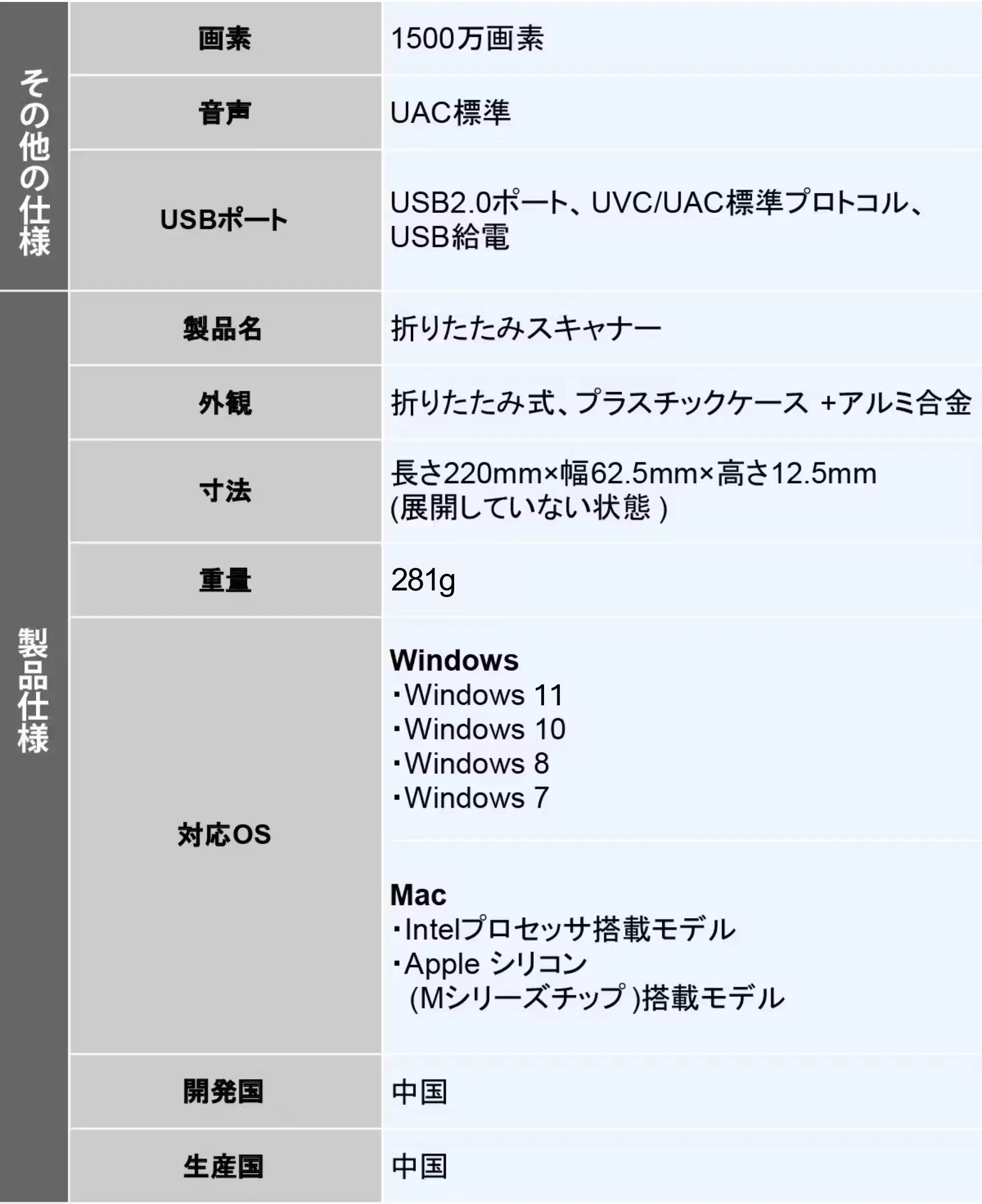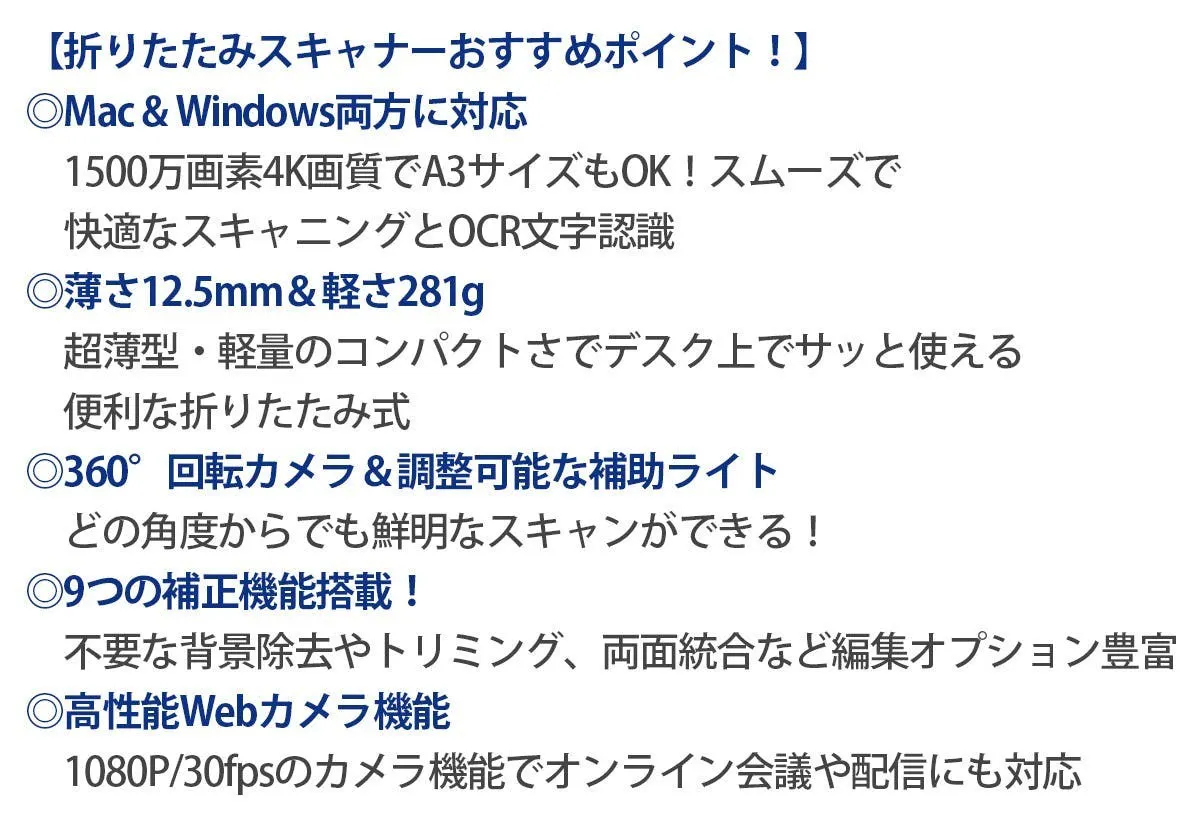 「折りたたみスキャナー」は、効率的かつ高品質なスキャンが可能な製品を提供するために開発されました。超薄型で軽量なボディに、360°全方位スキャン機能や9種類の補正機能、1500万画素の4K高精細カメラを搭載し、どこでも簡単に高解像度のスキャンを実現します。