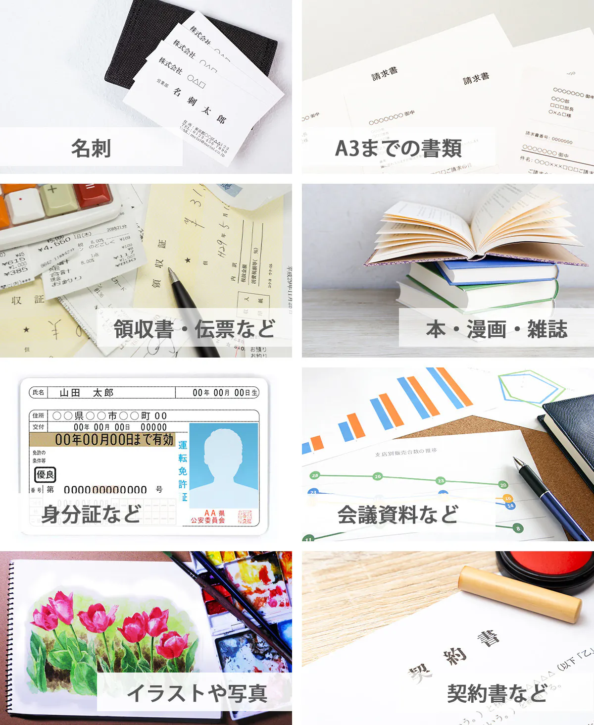 名刺などの小さなサイズのものからA3サイズまで、幅広いサイズの書類をお手軽にデジタル化できます。