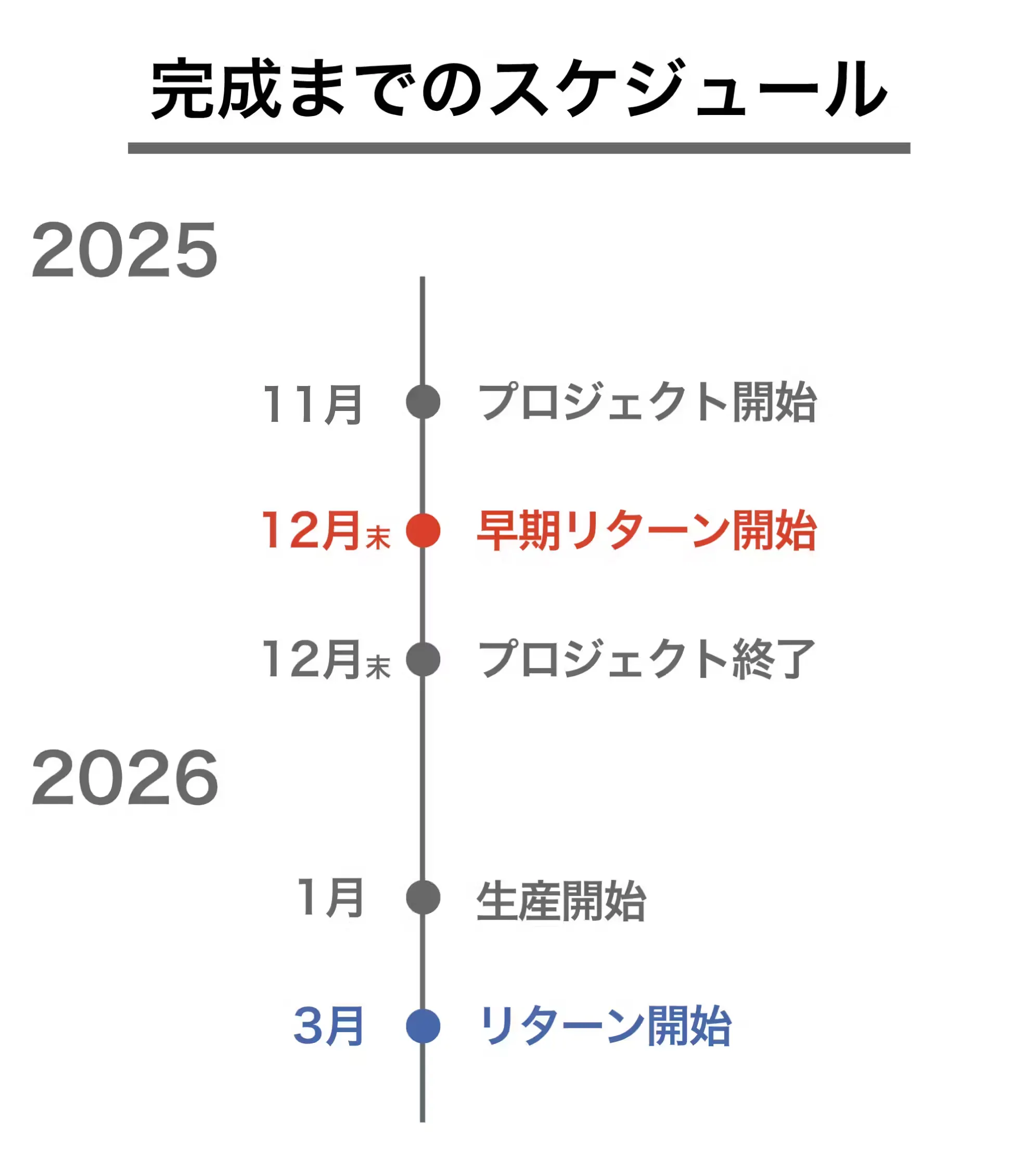 ※本文中に記載させていただいたスケジュールは、あくまでプロジェクト公開時点の予定です。クラウドファンディングの性質上、配送遅延のおそれがございます。