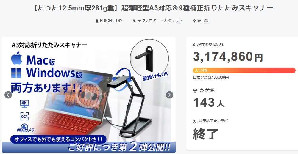 皆様にご満足いただけるリターンをお届けできるよう、全力で取り組んで参りますので引き続き、「【たった12.5mm厚281g重】超薄軽型A3対応&9種補正折りたたみスキャナー」をよろしくお願い致します。