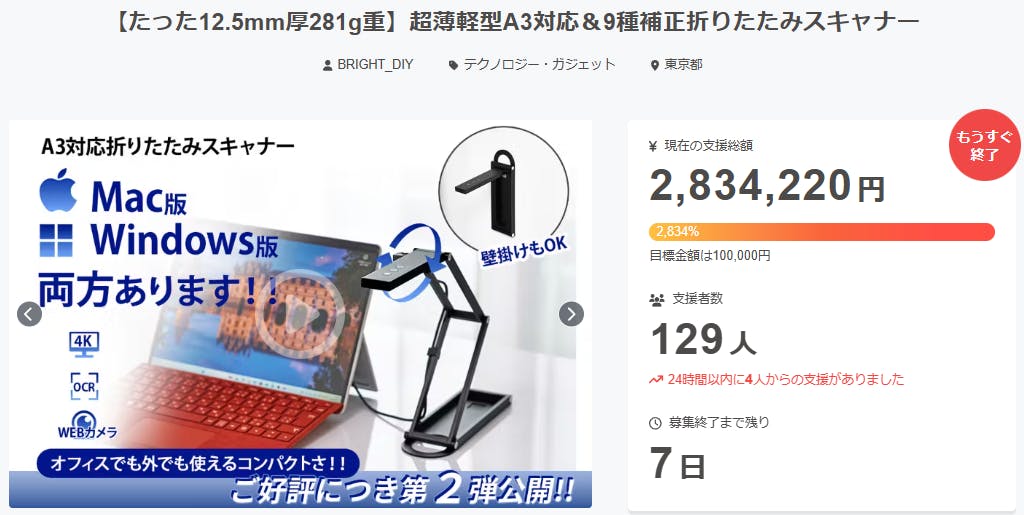 2025/12/07 12:00ご支援者様、【たった12.5mm厚281g重】超薄軽型A3対応&9種補正折りたたみスキャナーにご興味をお持ちいただきありがとうございます。お陰様で、開始から支援総額280万円達成することができました!終了までわずか7日となります。<薄さ12.5mm・重さ281gの超薄型A3対応折りたたみスキャナー。360度回転カメラと9種の補正機能で、書類を1秒で鮮明にスキャンできます。Webカメラにもなる一台で完結するオールインワンデバイスです。?プロジェクト終了後、「【たった12.5mm厚281g重】超薄軽型A3対応&9種補正折りたたみスキャナー」をCampfire特別価格で入手することはできなくなりますので、ご支援がまだの方、追加支援をご検討の方はお急ぎくださいますようお願い申し上げます。ご興味のある方、ぜひ支援お願い致します。https://camp-fire.jp/projects/890903/viewBrightチームは、当プロジェクトをもっと多くの方に知っていただきたいと考えております。よかったら、FacebookやTwitter等のSNSでのシェア・拡散をお願い致します。#折りたたみスキャナー #brightdiyどうぞよろしくお願い致します。Brightチーム もっと見る
