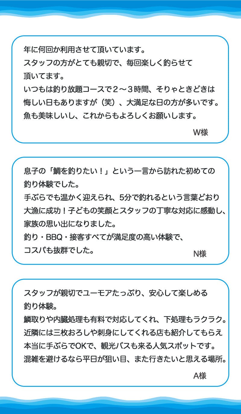 釣り道具もエサもすべて完備されており、初心者やお子様、女性グループでも安心してチャレンジできます。