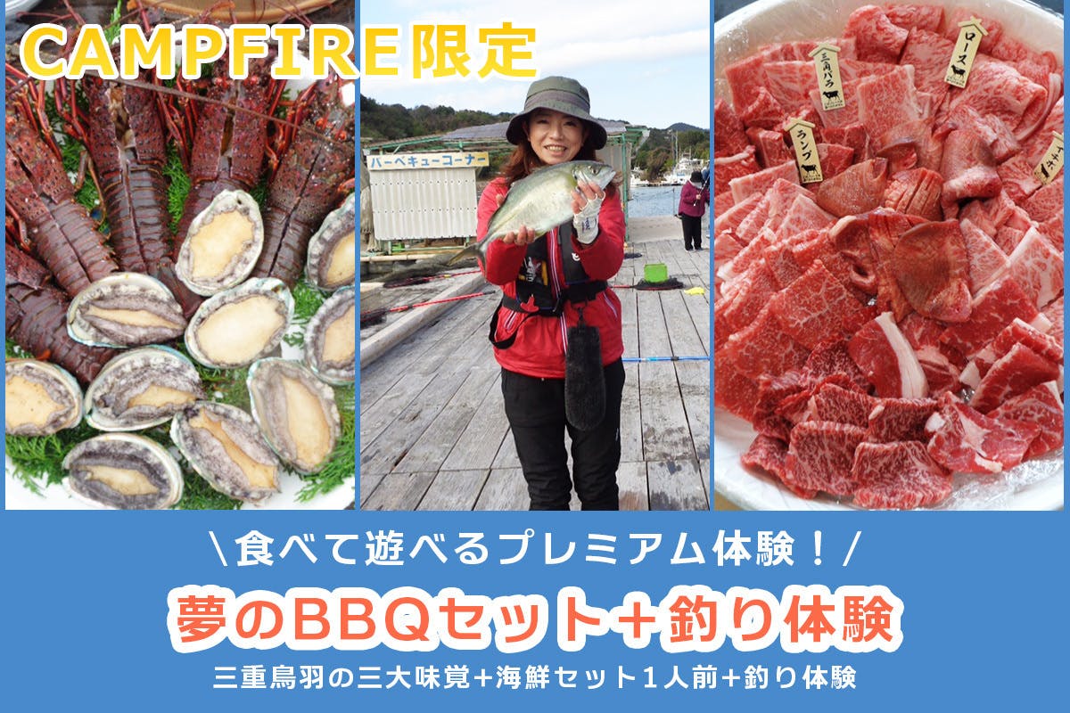 50,000円 ★CAMPFIRE限定★夢のBBQセット 【三重鳥羽の三大味覚+海鮮セット1人前+釣り体験】 食べて遊べるお得なプレミアム体験! |