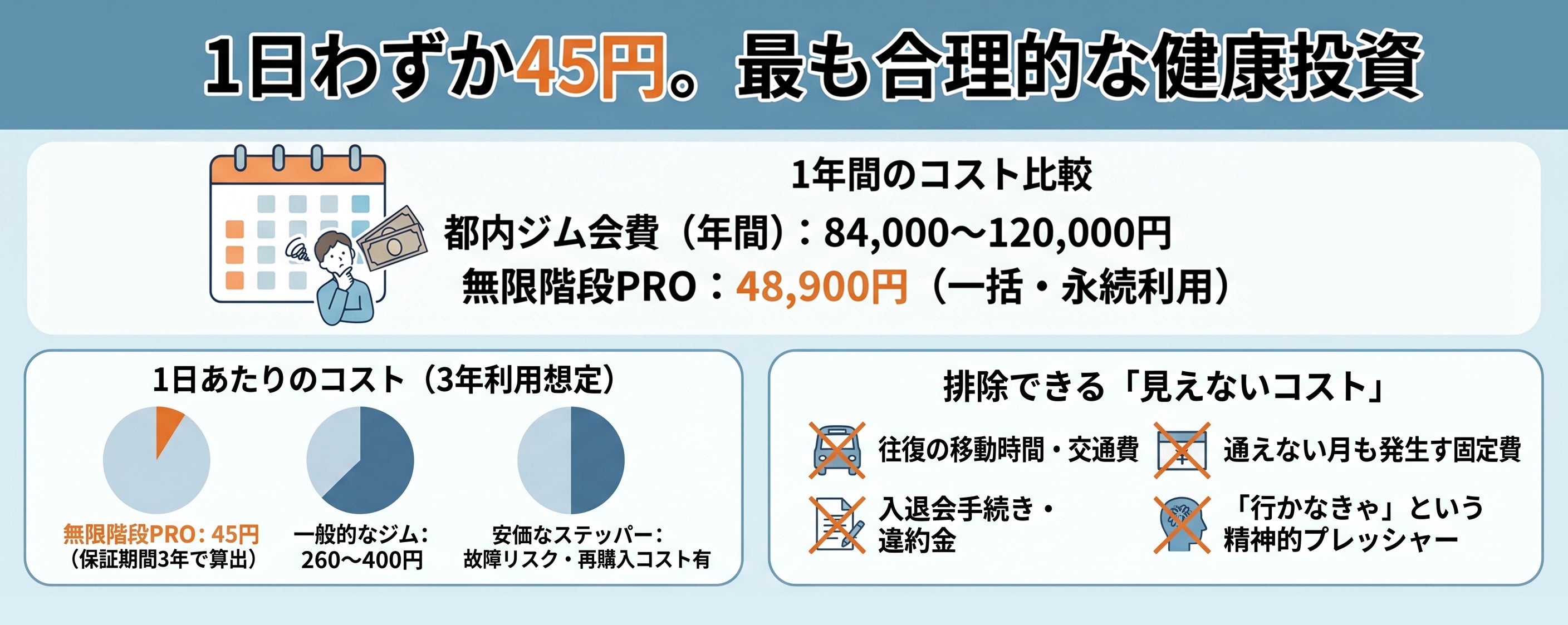 2026/04/20 19:00支援者の皆様 いつもご支援をいただき、誠にありがとうございます。日本フィットエイブル株式会社でございます。「5万円は高い」 そう感じている方に、一度だけ計算していただきたい数字があります。■ 1年間のコスト比較• 都内ジム会費(年間):84,000〜120,000円• 無限階段PRO:48,900円(一括・永続利用)ジムに通う場合、わずか半年で本体代金を超えます。■ 1日あたりのコスト(3年利用想定)• 無限階段PRO:45円(保証期間3年で算出)• 一般的なジム:260〜400円• 安価なステッパー:故障リスク・再購入コスト有■ 排除できる「見えないコスト」• 往復の移動時間・交通費• 通えない月も発生する固定費• 入退会手続き・違約金「行かなきゃ」という精神的プレッシャー終了後、この価格に戻ることはありません。 今、この瞬間が最も合理的な投資タイミングです。一日も早くお届けできるよう準備を進めております。 引き続き、よろしくお願いいたします。 もっと見る【重要】商品の倉庫入庫および発送スケジュールに関するご案内 支援者の皆様
