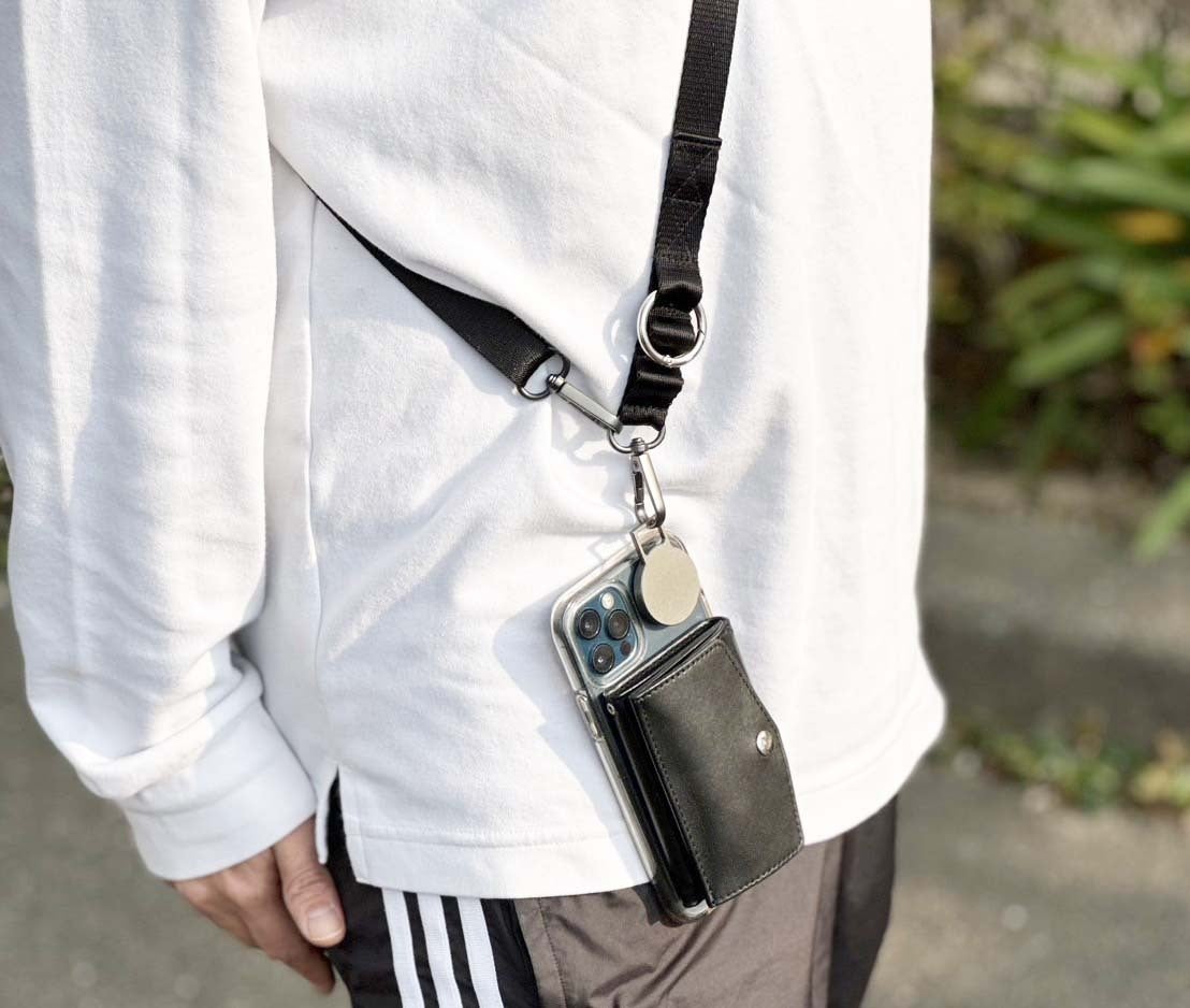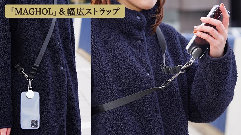 apple純正のクロスボディストラップでも、「MAGHOL」が使えます。スマホケースのストラップ穴に左右されることなく、ご利用できます。ストラップとスマホの着脱がスムーズになるので、「MAGHOL」との相性が抜群です。
