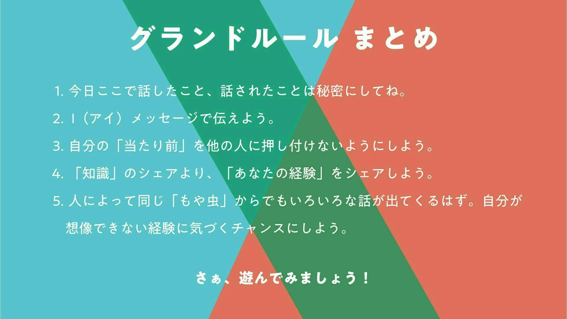手元に3匹の「もや虫」を捕まえるまで、グループ内で順番に話をします。もちろん、話したくないことは話さなくて大丈夫です。