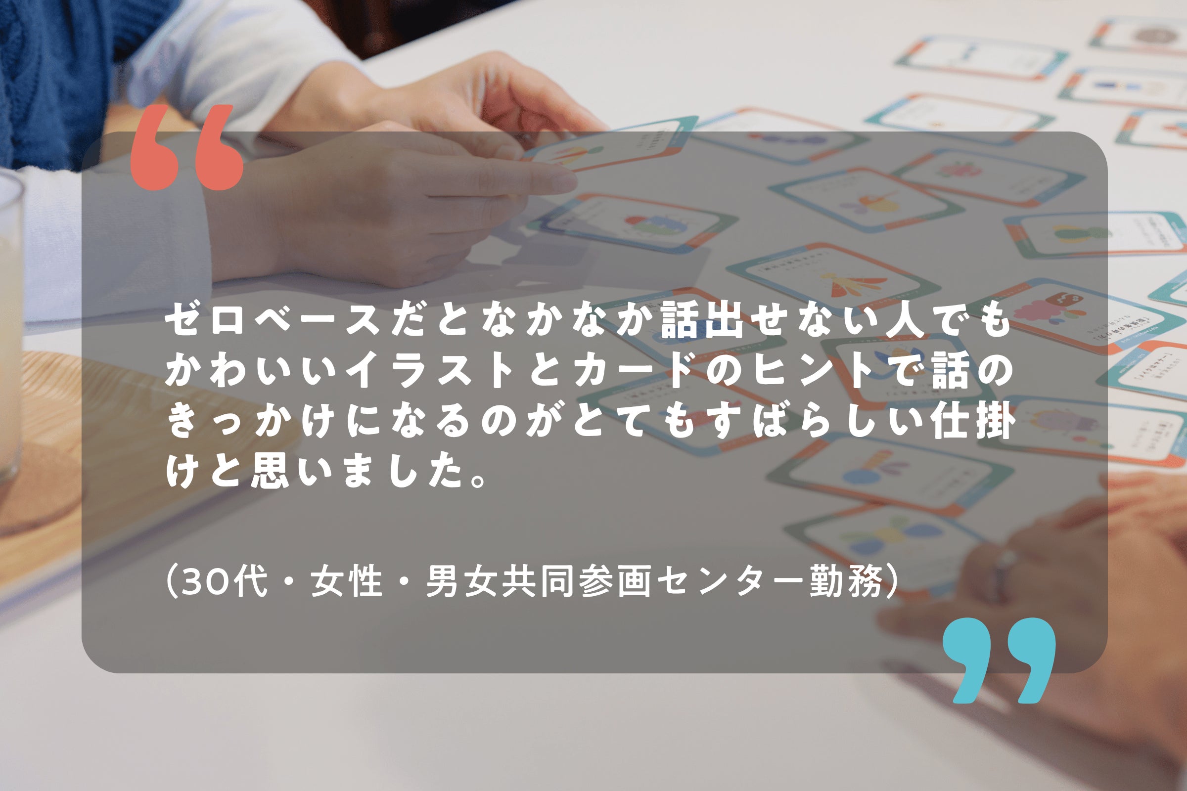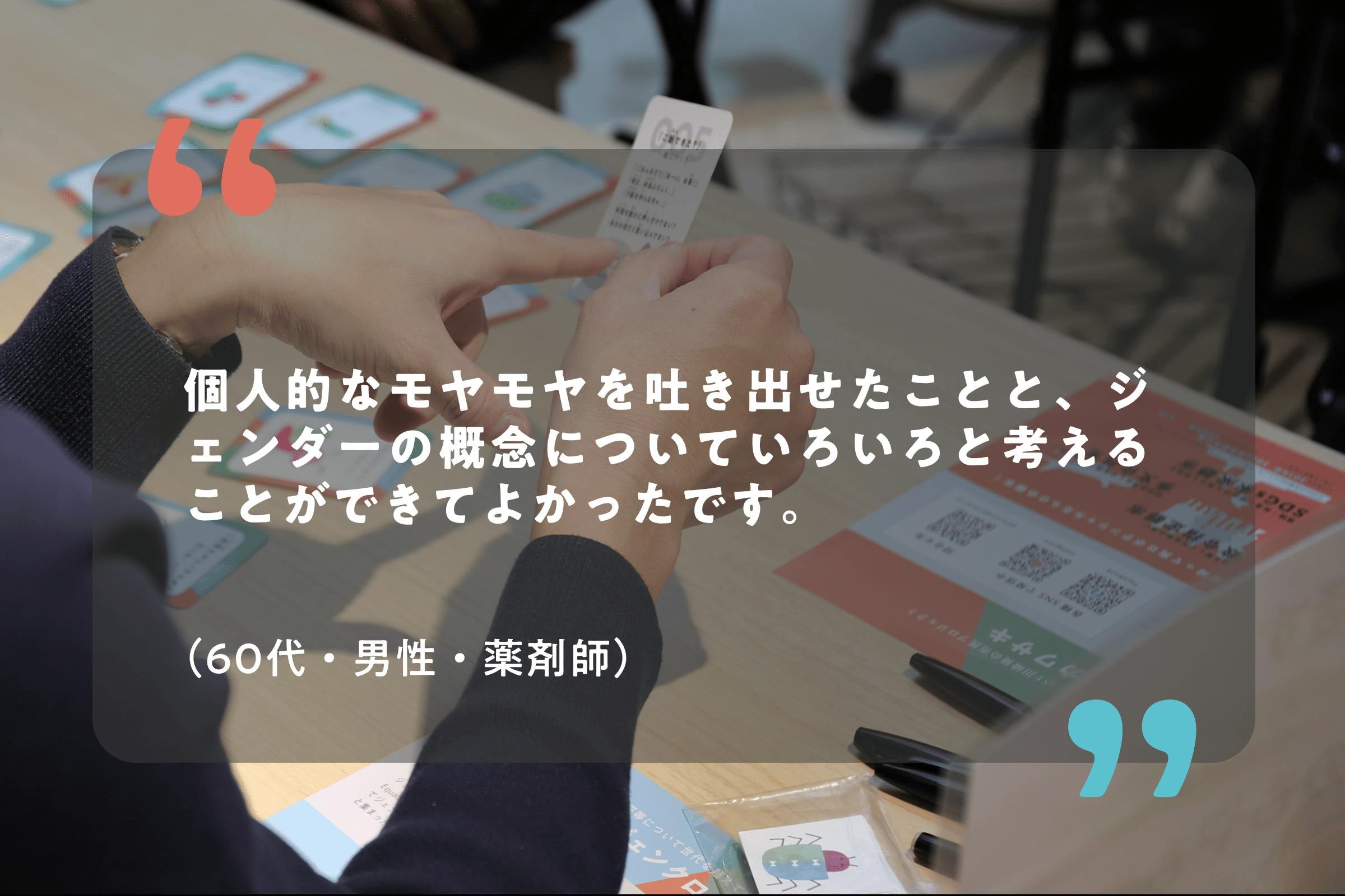特に印象的なのは、通常のジェンダーイベントでは参加の少ない男性も、このカードゲームには積極的に参加してくださっていることです。「カードを通すことで対等に話せる」「気軽に入っていける」という声をたくさんいただいています。