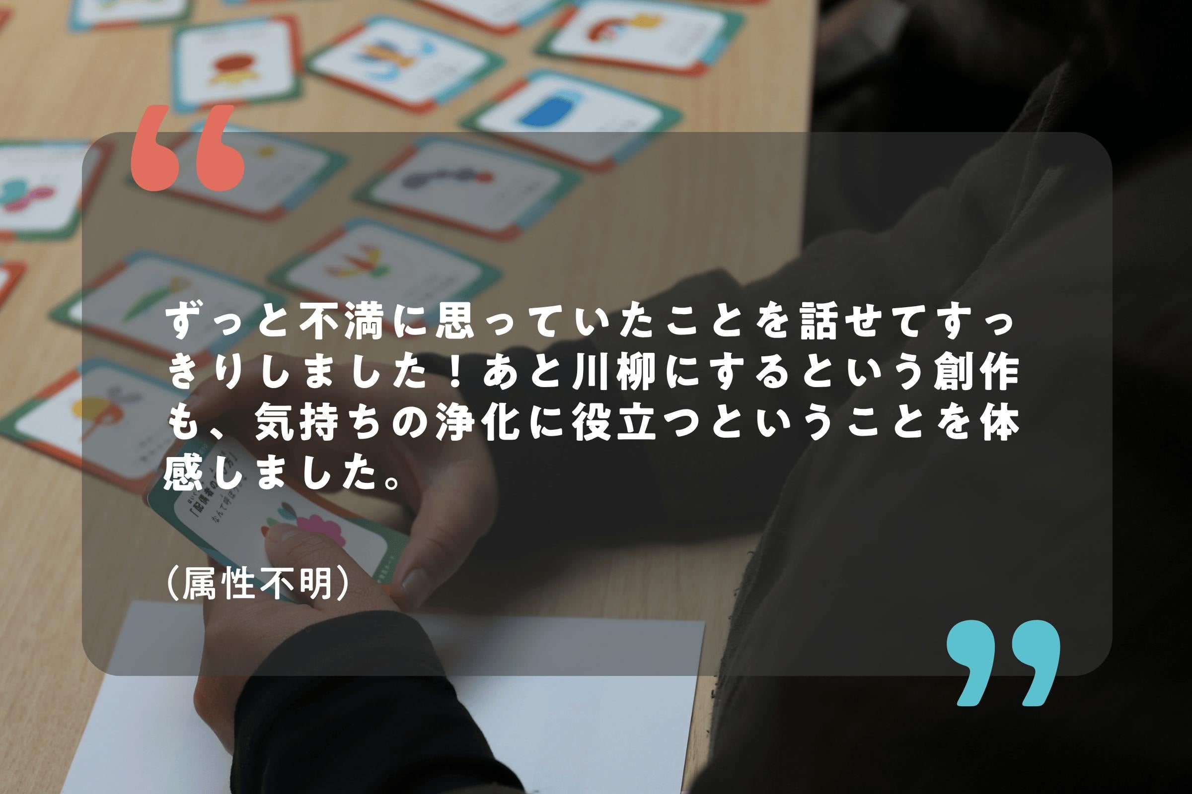最後に全員で川柳を詠んで「もや虫退散!」することで、ゲームとしては終わりですが、川柳を詠まずにひたすら「もや虫」を捕まえ続けて語り合うのも、盛り上がってとても楽しいです。ジェンダーを切り口にこんなに話が盛り上がったのは初めて!と体験された方はみなさん驚かれます。