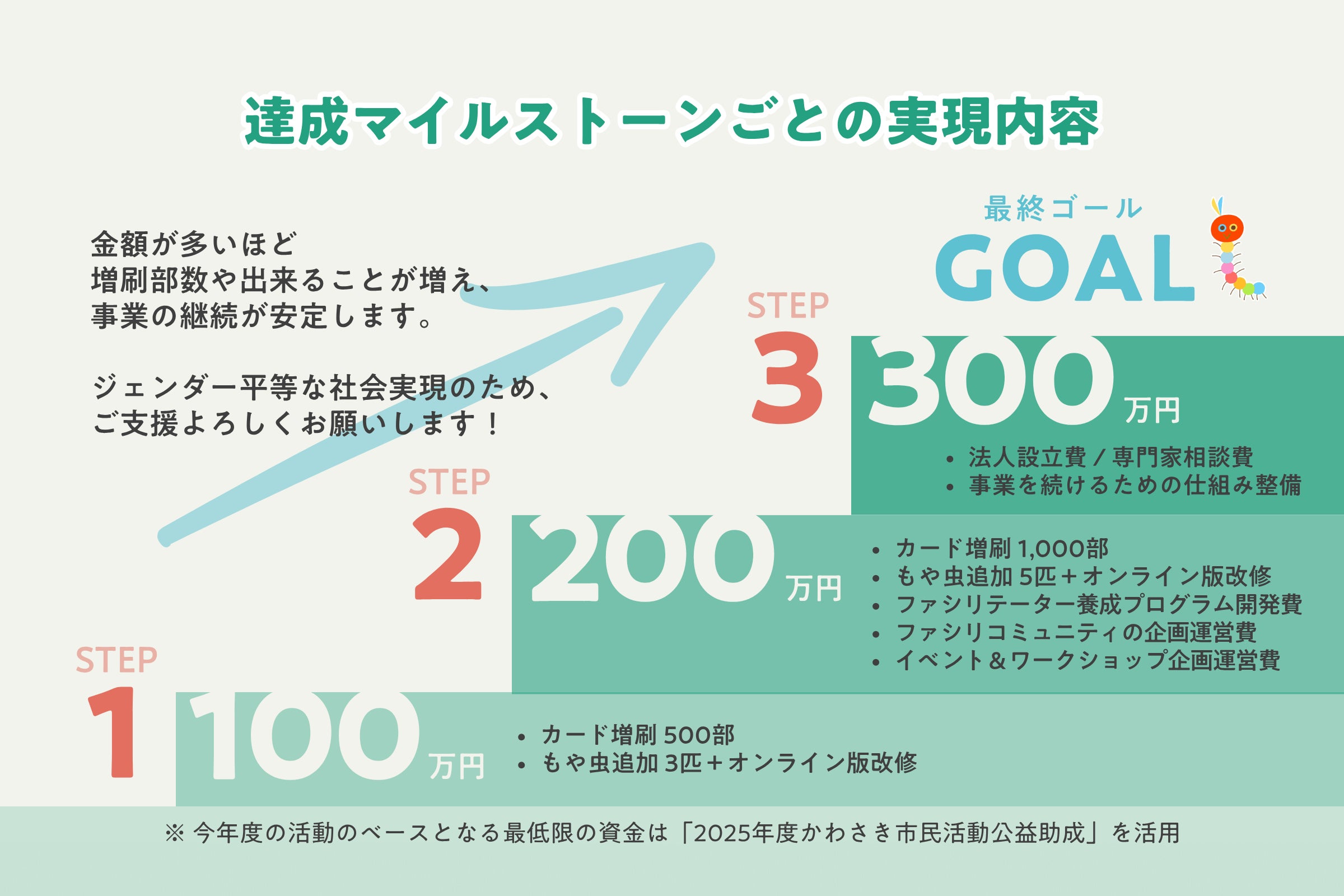 2025/12/30 10:45おかげさまで当初の目標を上回り、135名の方から2,213,000円ものご支援をいただき、達成率110%との結果でした。年明けに改めて個別のお礼、そしてリターン準備などを進めていきます。引き続きどうぞよろしくお願いします。改めてご支援および拡散などご協力いただいた皆様、本当にありがとうございました。良いお年をお迎えください!ジェンクロス・カワサキ メンバー一同----------<常時メンバーも募集中>一緒に活動や制作に加わりたい!という川崎市内在住・在勤の方、是非メンバーになりませんか?現在20代から50代までのメンバー10名が所属し、自分のできることや楽しめることを中心に活動しています。一緒にジェンダーに関するもやもやについて楽しく学びを深めましょう!メンバー加入に興味のある方は genxross@niacari.jp までご連絡ください。 もっと見る