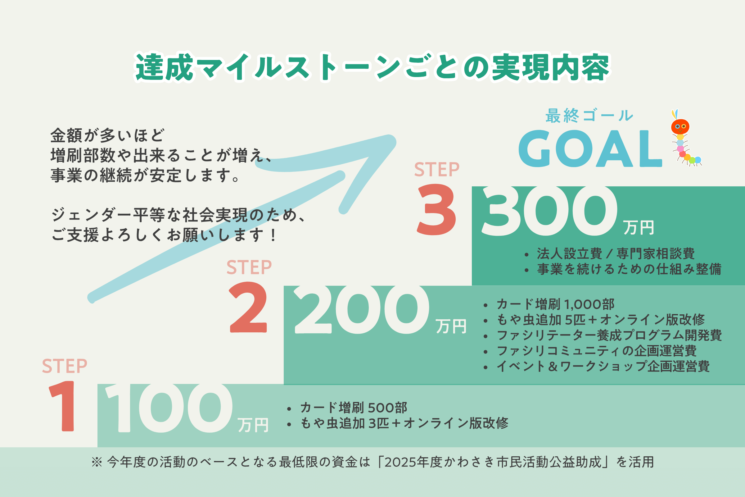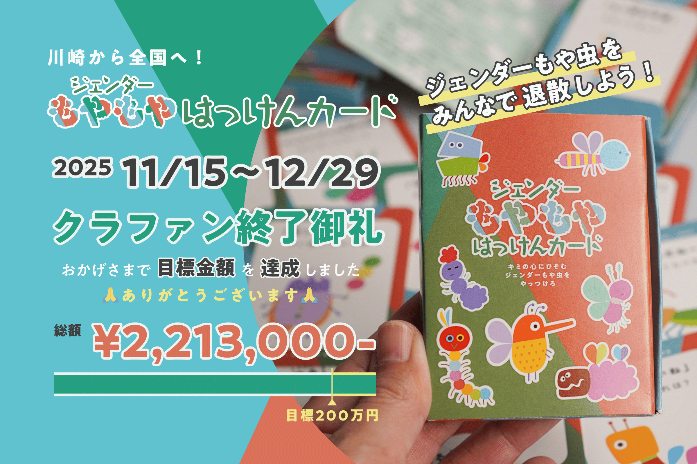 最終日の本日、みなさまのご支援のおかげで、目標200万円を達成することができました!本当に本当に本当にありがとうございます!!これで無事に1,000部増刷への道筋をつけることができました。内容を拡充した増刷のためのカード増強を進めてまいります。そしてクラファン終了まで残り9時間ですが、できるところまでの最後の挑戦として、ネクストゴール300万円に挑戦中です。カードを増刷してファシリテーターを増やし全国に広めたあと、ファシリテーター同士の相談や交流ができるクローズドコミュニティの運営や、この事業を永く続けていくための組織の仕組みづくりに活用させていただきたいと思います。と言いますのも、私たちメンバーは全員本業を別に持ちながら、この事業を全て市民活動としてボランティアで行っており(最低限の事業継続のための謝金などはいただいておりますが)、常にこの事業のためにフルタイムで時間を割けるわけではないからです。であれば、仕組みを作って、永く無理なく続く形にしていきたいと考えています。クラファン終了後もカード付きファシリテーター養成講座(有料)のご案内は事業として継続していきますが、私たちのリソース的に、まず2026年中はクラファン支援者を優先的に講座にご案内する予定です。ですので、カードを使ってみたい!と思われている方はクラファンを支援していただくのが、一番早く確実に入手できます。さらなる最後のひと押しで、本クラファンを周囲におすすめしていただけたら幸いです。以下の投稿をリツイート(X)、シェア(Facebook)、リポスト(Instagram)していただけたらとっても嬉しいです。▶ X(旧Twitter)は こちら▶︎ Facebookは こちら▶︎ Instagramは こちらぜひ応援コメントや「#ジェンダーもやもや発見カード 」のハッシュタグを添えていただけると、励みになります。本日 23:59 最後まで全力で走り抜けます。応援よろしくお願いします!ジェンクロス・カワサキ メンバー一同----------<常時メンバーも募集中>一緒に活動や制作に加わりたい!という川崎市内在住・在勤の方、是非メンバーになりませんか?現在20代から50代までのメンバー10名が所属し、自分のできることや楽しめることを中心に活動しています。特に、クラファン実施は初めての経験で猫の手も借りたい状態です。一緒にジェンダーに関するもやもやについて楽しく学びを深めましょう!メンバー加入に興味のある方は genxross@niacari.jp までご連絡ください。