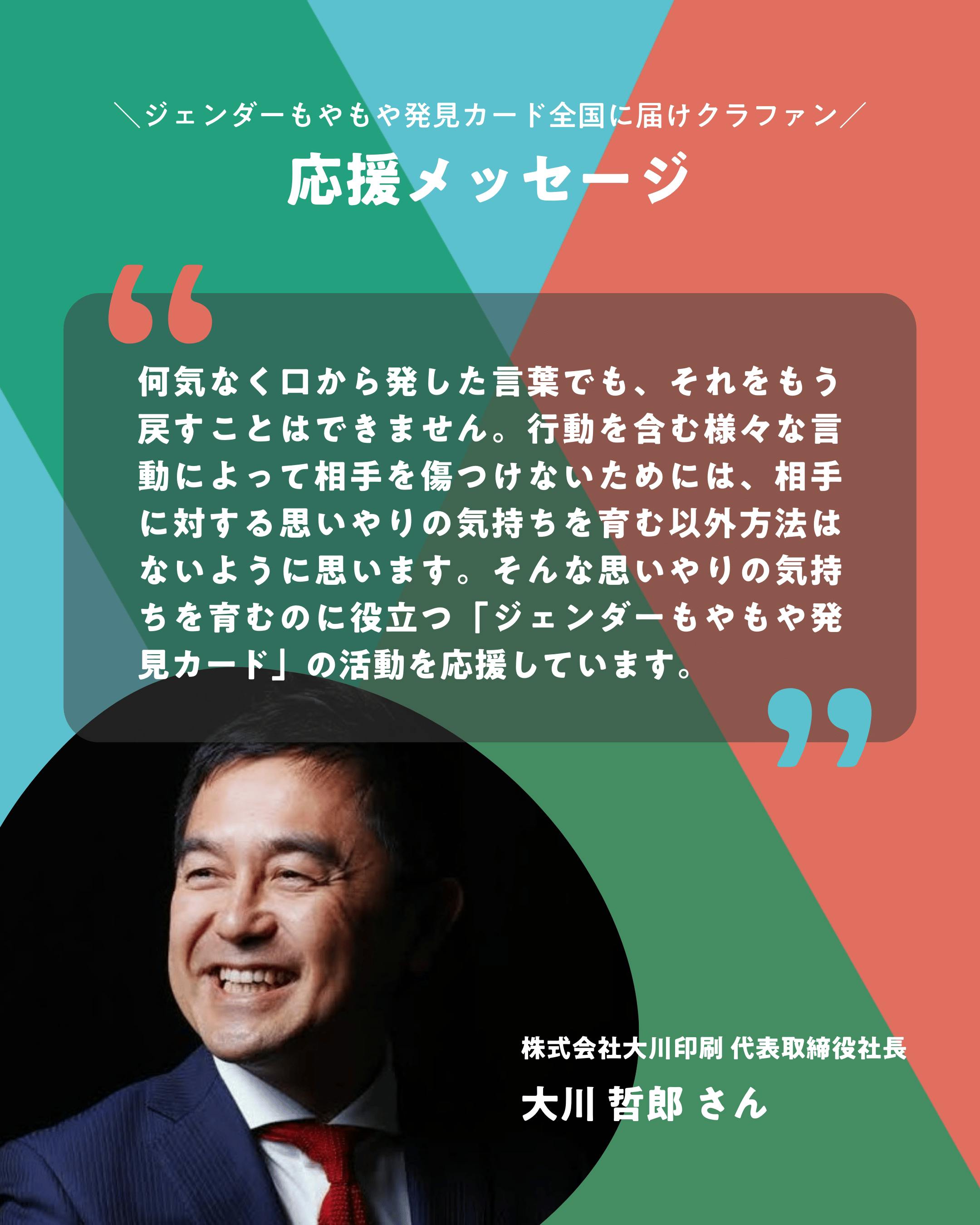 • 株式会社大川印刷 代表取締役社長 大川哲郎さんからの応援メッセージ============================何気なく口から発した言葉でも、それをもう戻すことはできません。行動を含む様々な言動によって相手を傷つけないためには、相手に対する思いやりの気持ちを育む以外方法はないように思います。そんな思いやりの気持ちを育むのに役立つ「ジェンダーもやもや発見カード」の活動を応援しています。============================大川印刷 公式サイトhttps://www.ohkawa-inc.co.jp/◎ 大川 哲郎(株式会社大川印刷 代表取締役社長)1967年横浜生まれ 幼少期から生き物や植物、自然が好きで、自然と触れ合いながら育つ。大学に入学した直後、父親を医療ミスで失う。大学卒業後3年間、東京の印刷会社で修行後、大川印刷へ入社。横浜青年会議所で、2002年社会起業家の調査研究、2004年に企業の社会貢献・CSRの調査研究を機に2005年、本業を通じて社会課題解決を行う「ソーシャルプリンティングカンパニー®」というビジョンを掲げ、現在に至る。再エネ100%での事業を中小企業として日本で初めて実現した、環境先進プリンティングカンパニー大川印刷の大川哲郎社長からの、嬉しいメッセージ。限られた予算の中「ジェンダーもやもや発見カード」を刷りたい、しかもできるだけ環境に良い方法で制作したい、という私たちの無茶な相談にも、真摯にとても丁寧に応えてくださったおかげで、「ジェンダーもやもや発見カード」が生まれたといっても過言ではありません。そして、私たちのところに来る問い合わせも「大川印刷さんの作例集を見て」というお声が少なくありません。大川印刷さんのYouTubeアカウントでも、過去に大川社長と代表・岡田の対談動画を配信して頂いています。是非ご覧ください。    このクラファンで集まった資金で、また大川印刷さんに印刷を依頼する予定です。いつも応援してくださりありがとうございます。メッセージありがとうございました!クラウドファンディング終了まで残り36日、最後までご支援どうかよろしくお願いいたします。ジェンクロス・カワサキメンバー一同----------<常時メンバーも募集中>一緒に活動や制作に加わりたい!という川崎市内在住・在勤の方、是非メンバーになりませんか?現在20代から50代までのメンバー10名が所属し、自分のできることや楽しめることを中心に活動しています。特に、クラファン実施は初めての経験で猫の手も借りたい状態です。一緒にジェンダーに関するもやもやについて楽しく学びを深めましょう!メンバー加入に興味のある方は genxross@niacari.jp までご連絡ください。 もっと見る