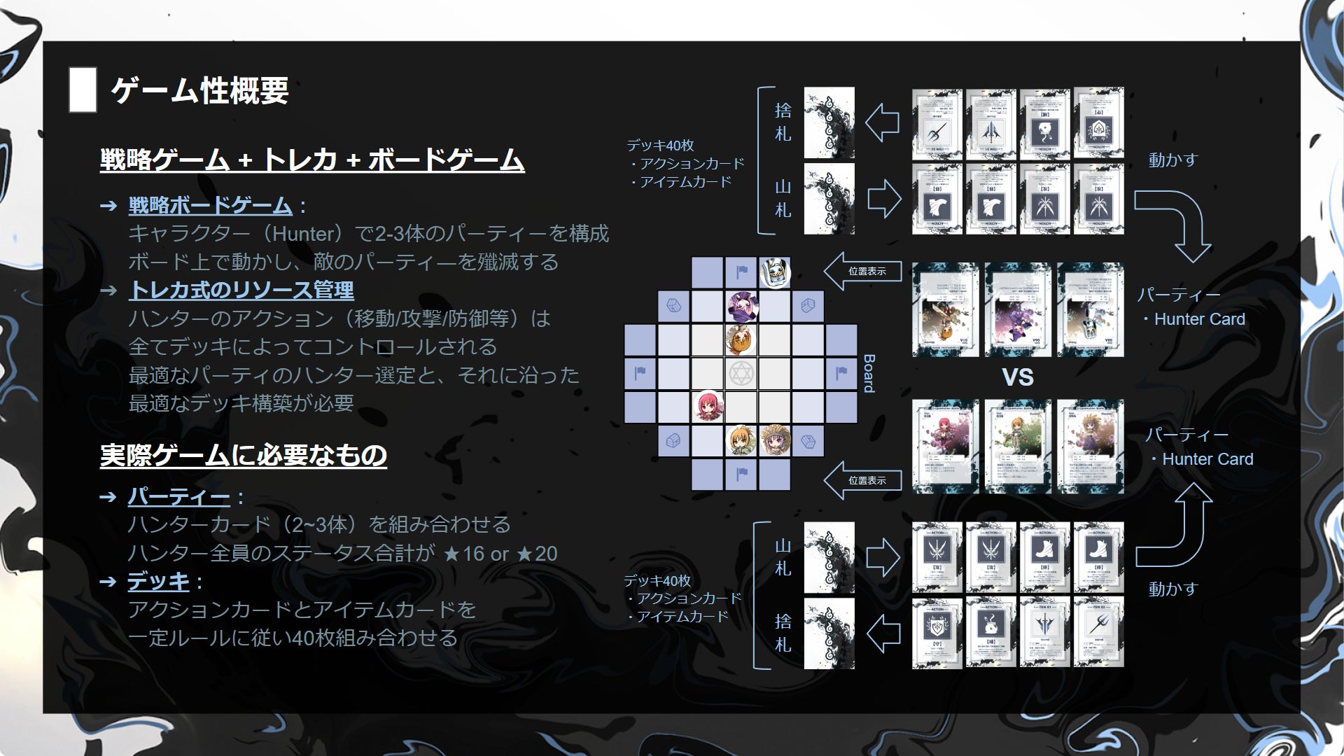 カードは「ハンターカード」「アクションカード」「アイテムカード」3種類あり、ハンターカードは戦うユニットでありデッキに入っていない、アクションカードとアイテムカードでデッキを構成しハンターを動かしていき、敵のハンターを殲滅できれば勝利です。