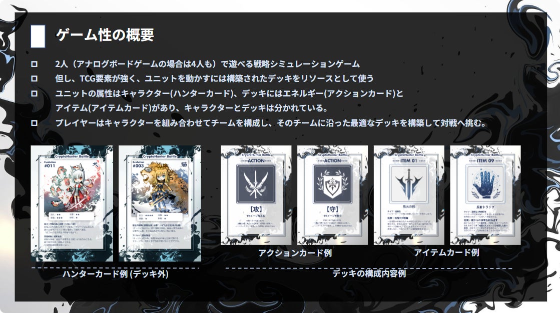 CryptoHunter はTCG(トレーディングカード)要素を持ったグリッド対戦ゲームであり、構築されたデッキをリソースとしボード上のユニットを動かし敵を倒す、TCGとタクティクス両方の特徴を備えています。