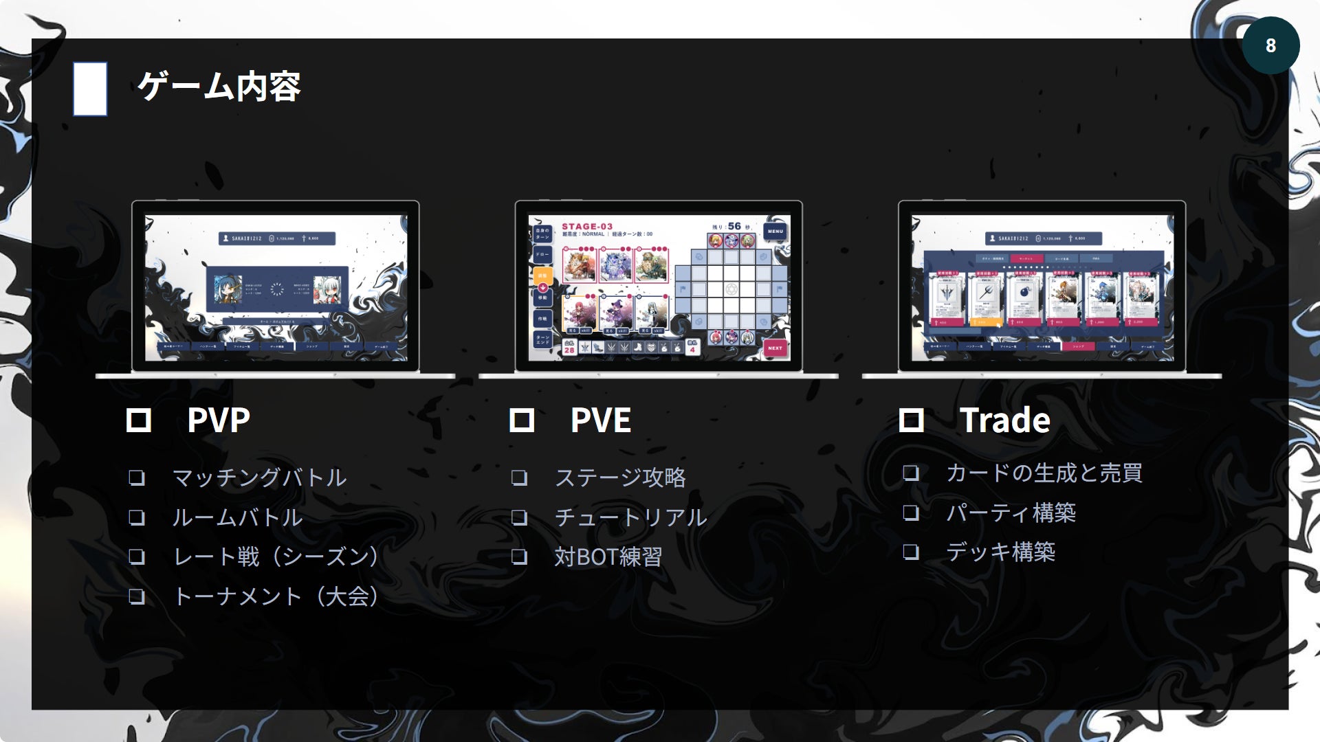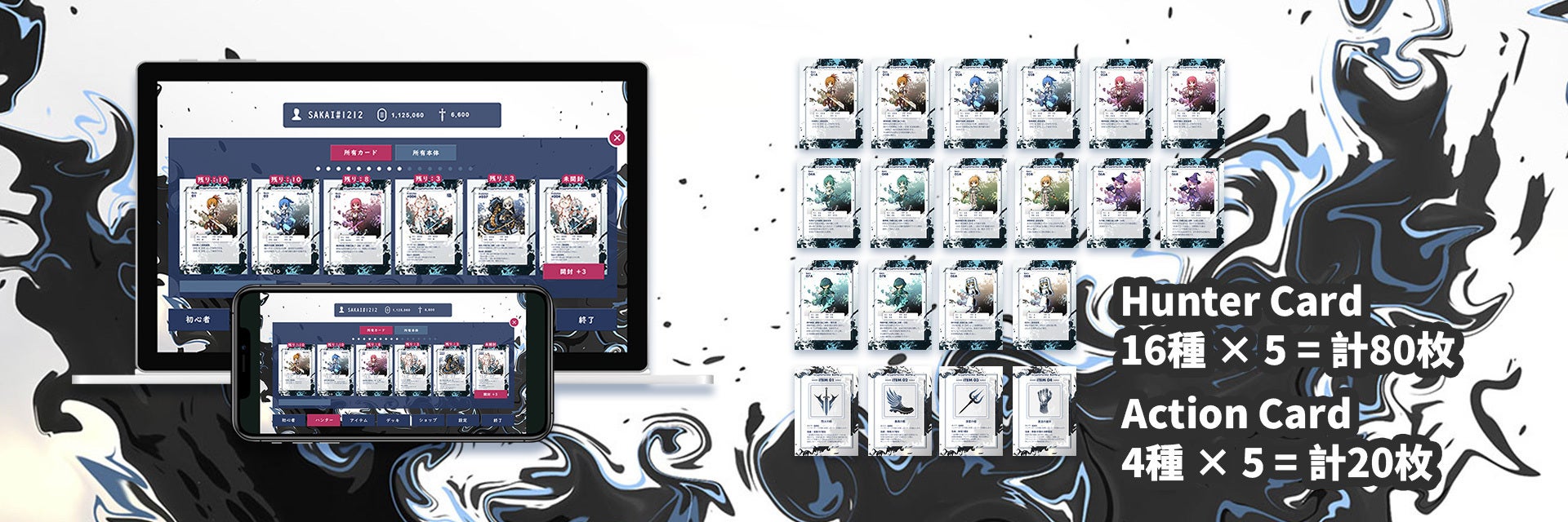 このゲームはゲーム内のキャラクターやアイテムが沢山存在し、より強いハンターのコンビネーションを作ったり、デッキを構築したり、更にアイテムの取引やトレードのできるようにしています。