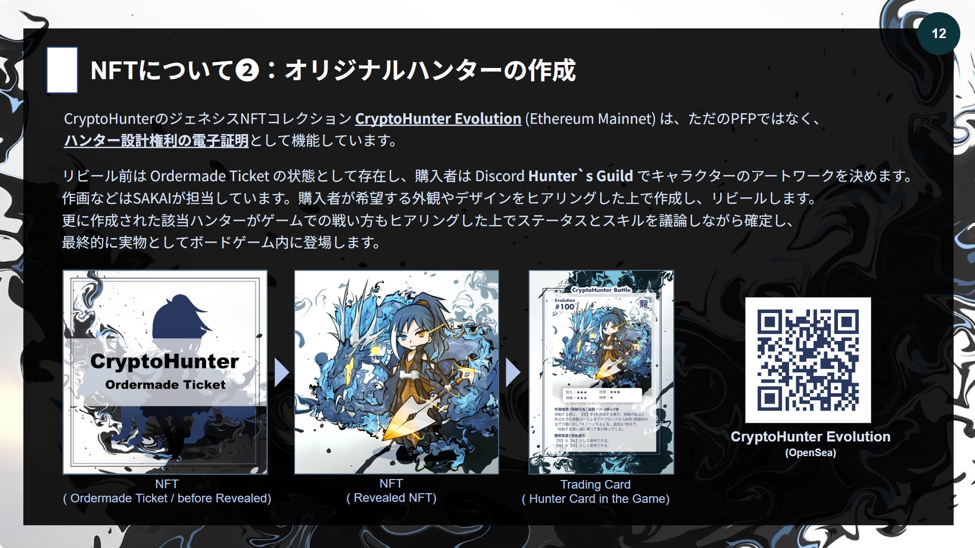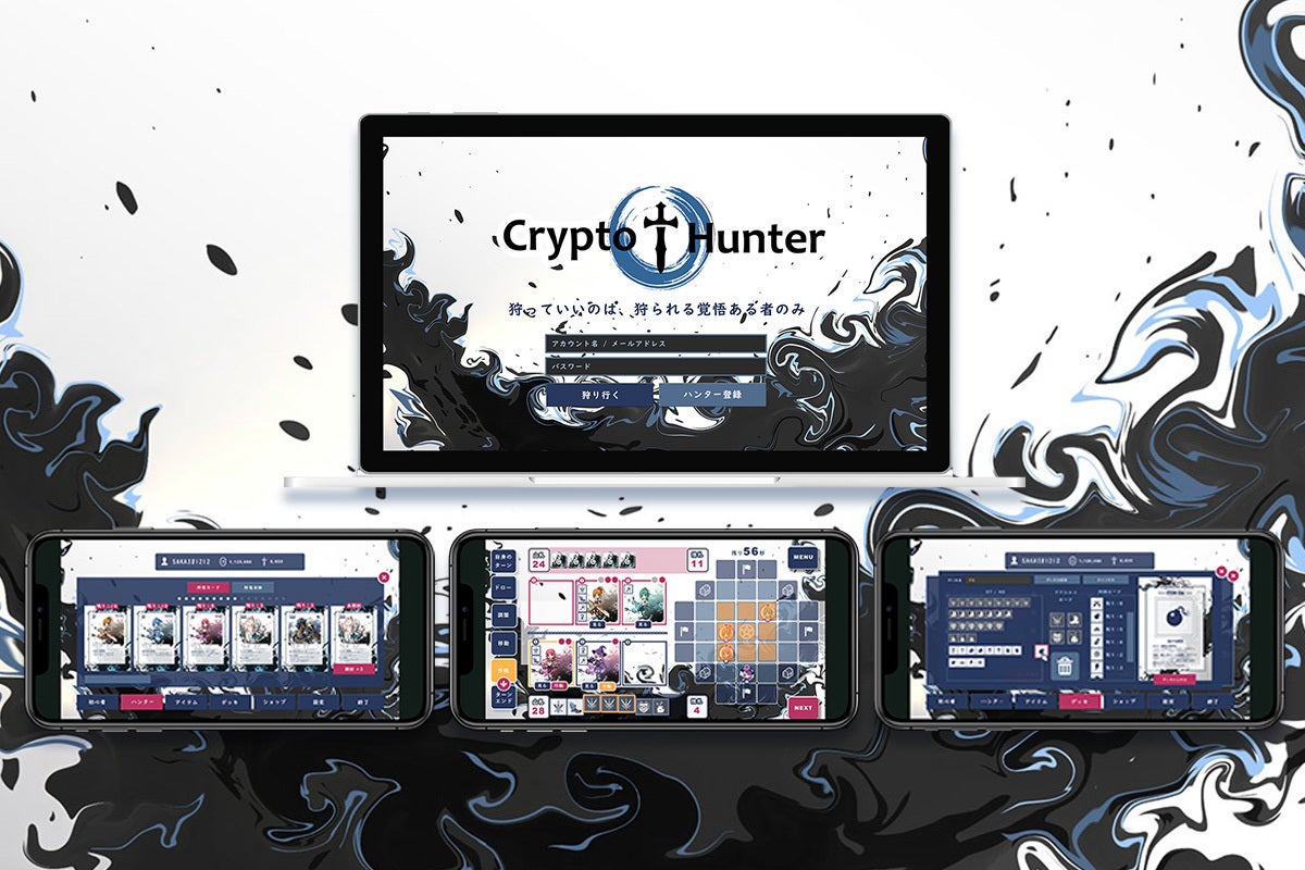 CryptoHunter は弊社初の独自IPで、2022年12月に初めてデジタルアートとして発表し(AIは使用せず、私自身が絵師として作画しています)、2023年7月ボードゲームを作り始め、おかげ様で現在第六版までリリースする事が出来ました。