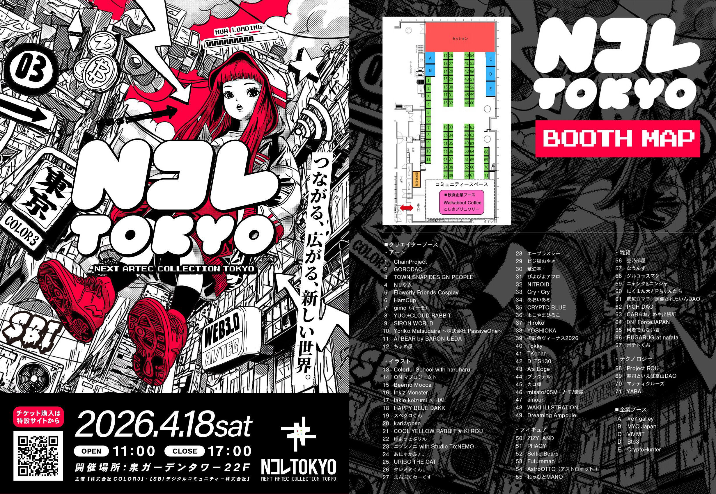 2026/04/13 18:01CryptoHunter をいつもご応援頂きありがとうございます!4/18(土)、アート×テクノロジー系の展示即売会「NコレTOKYO」に CryptoHunter が企業ブース・スポンサーとして出展します!イベント特設サイト:https://ncolle-tokyo.color3.co.jp/場所:東京都港区六本木1-6-1、泉ガーデンタワー 22F(SBIのところ)日時:4/18(土) 11:00~17:00チケット:上記特設サイトから事前購入は1000円、当日券2000円ブース場所:下記参照会場内ブースで CryptoHunter ゲームのアナログ版とデジタル版両方の試遊を儲けます。また、CryptoHunter 新作ボードゲーム PreniumDX (リターン❻実物ボードゲーム「CryptoHunter Prenium」1セット送付と同じもの)の販売も行っております。試遊頂いた方には、CryptoHunter 限定ポストカード、デジタルゲーム用のクーポン情報等をプレゼントします。更にゲームやグッズ購入頂いた方にはカードパックもプレゼントします。*CryptoHunter はスポンサーとして無料チケットを10枚確保しております、参加希望の方はCAMPFIREのDM機能でお申し出ください!皆様のご参加をお待ちしております! もっと見る