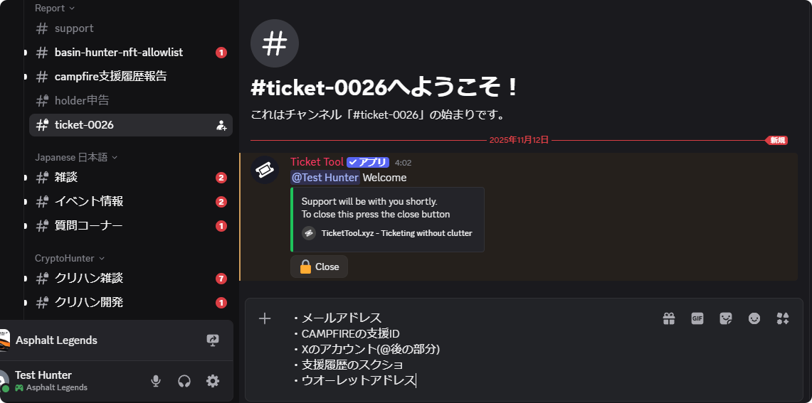 受取に伺う際は、必ずCryptoHunterの公式Discord「Hunter`s Guild」でチケットを切り、記載内容を全て入力した上、受取の旨をお伝えください!